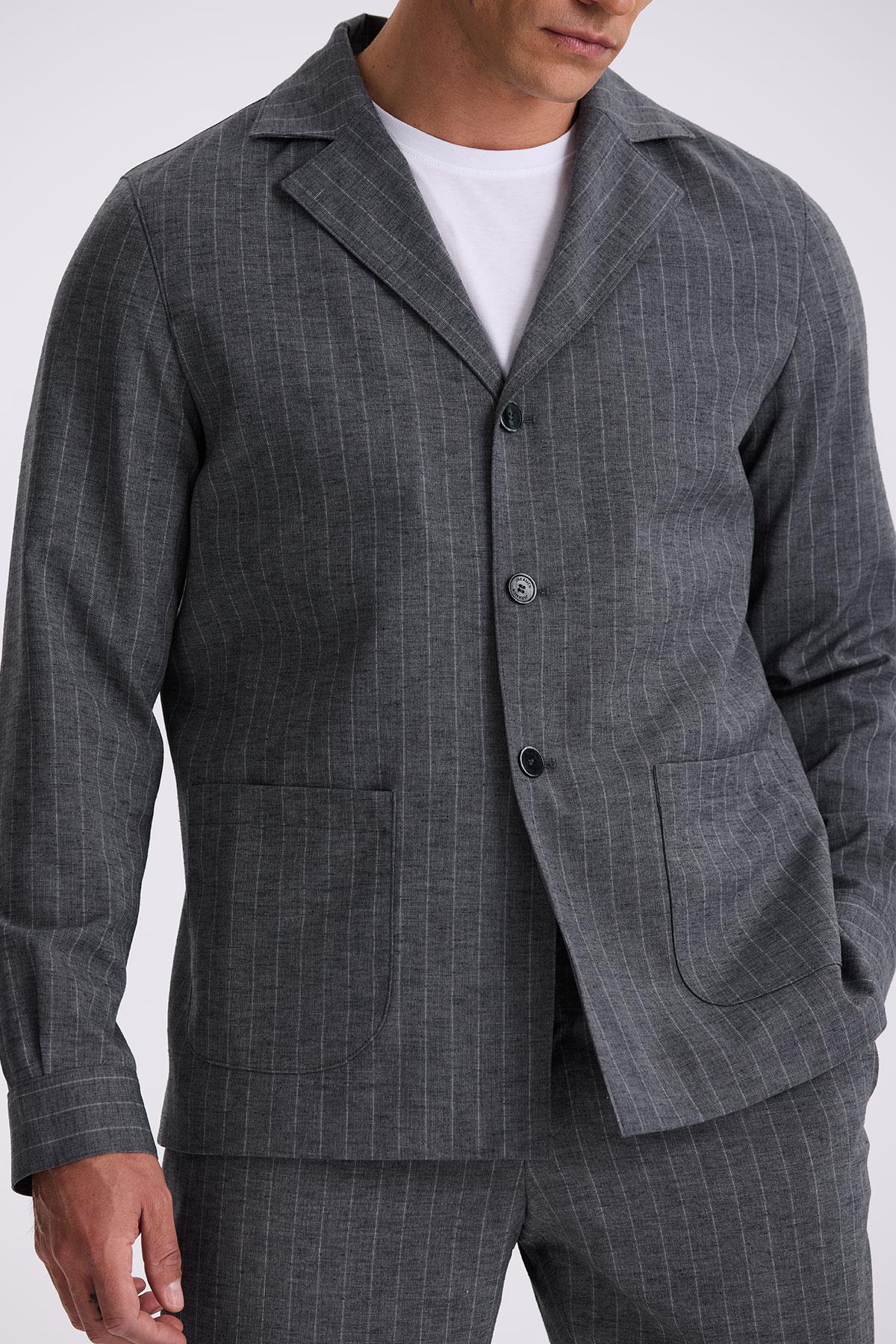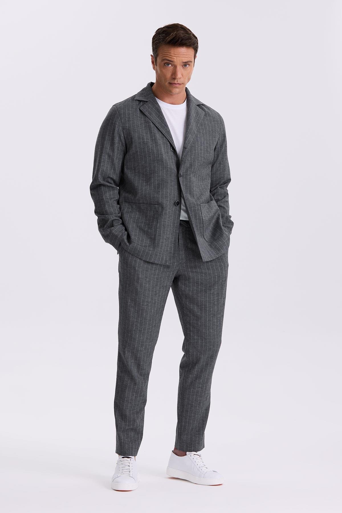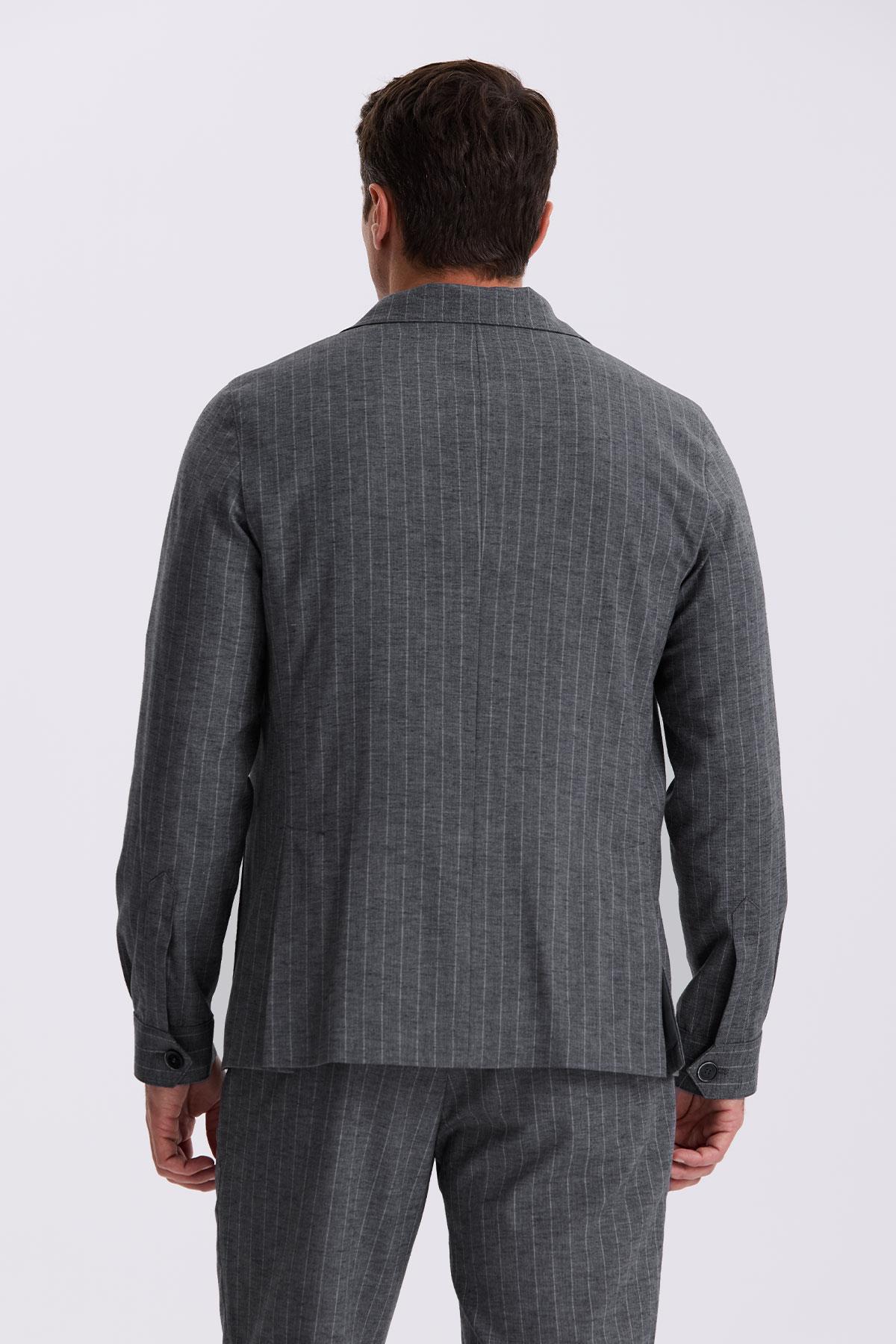 Antrasit Slim Fit Apaş Yaka Keten Karışımlı Çift Yırtmaçlı Çizgili Takım Elbise