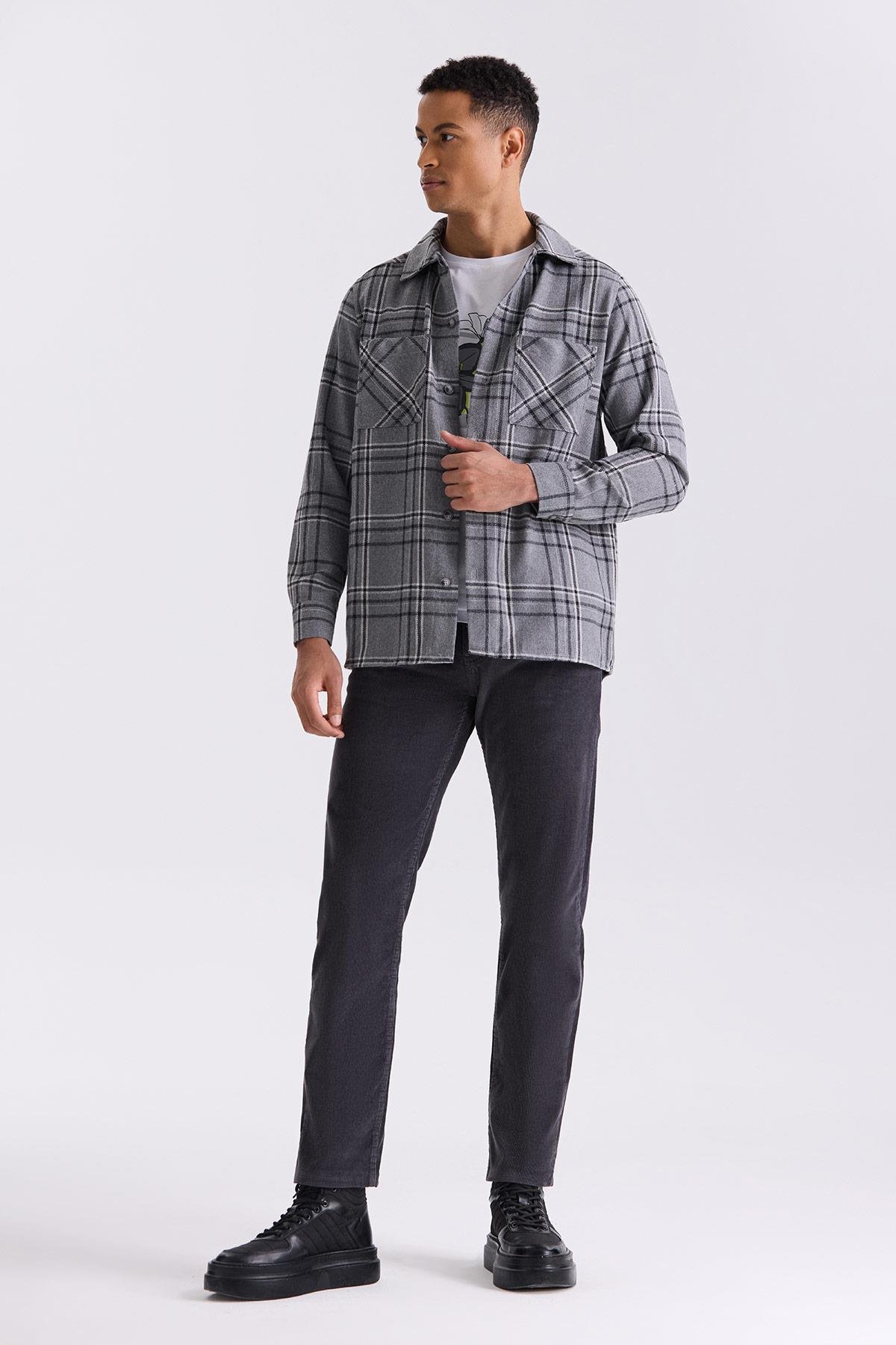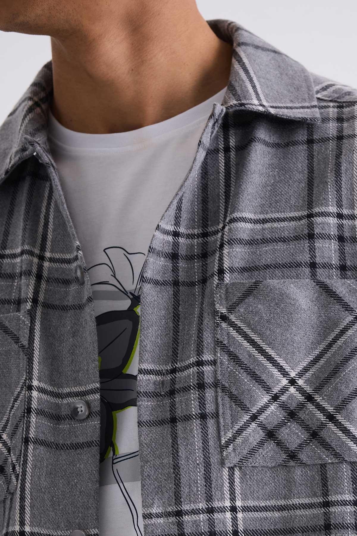 Antrasit Over Size Bol Kesim Ekose Desenli Pamuklu Cepli Oduncu Gömlek