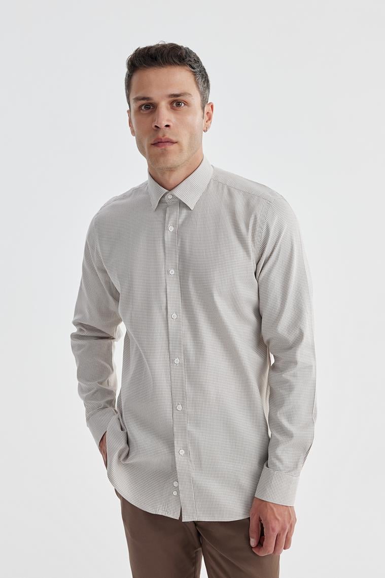 Bej Comfort Fit %100 Pamuk Piti Kare Gömlek