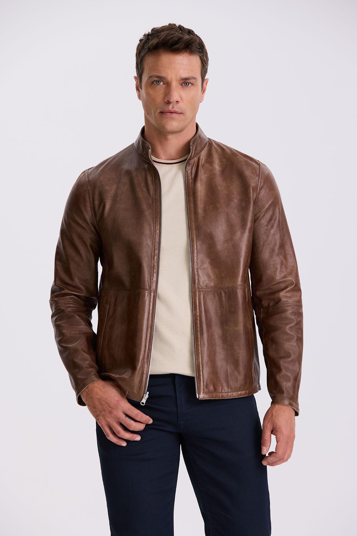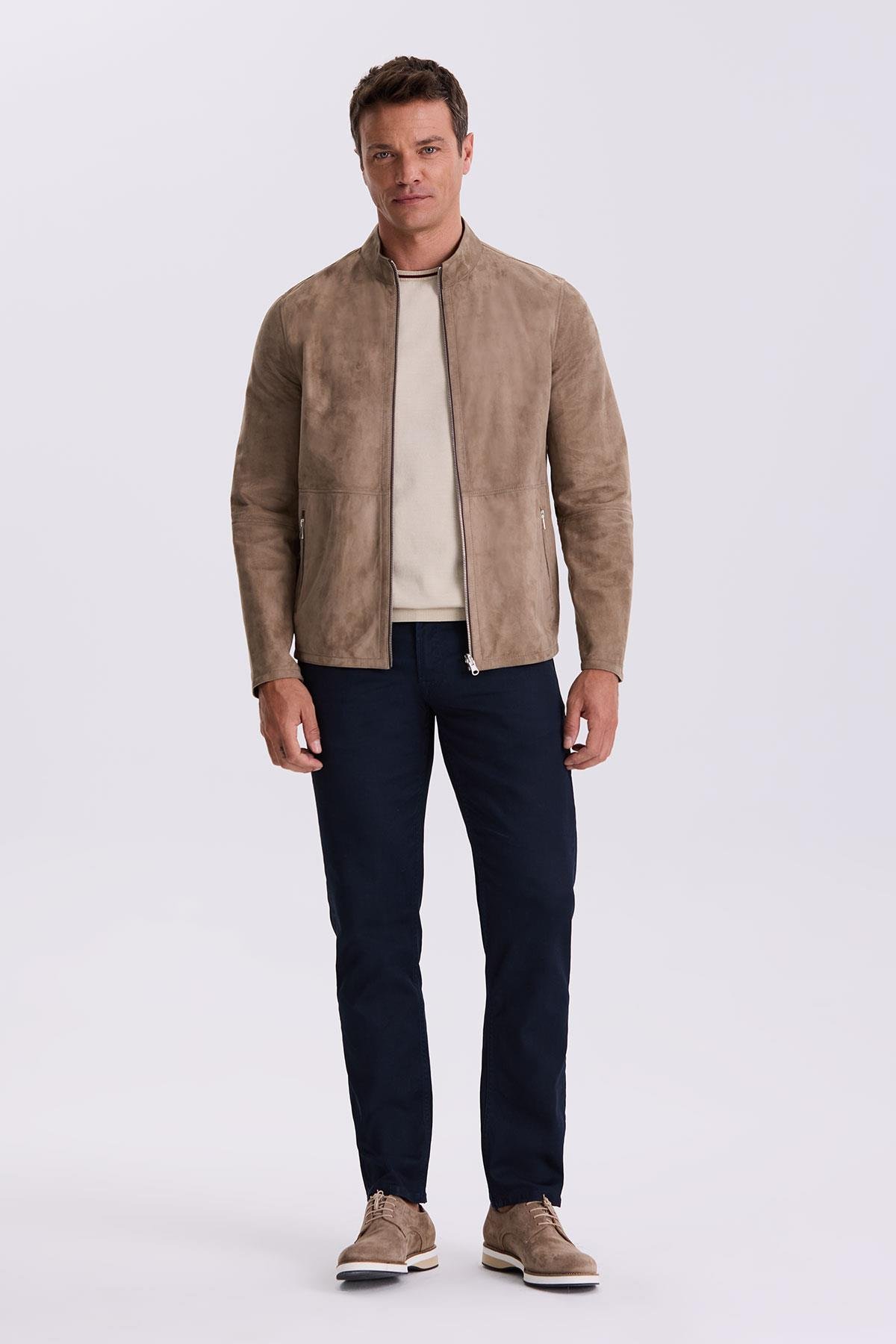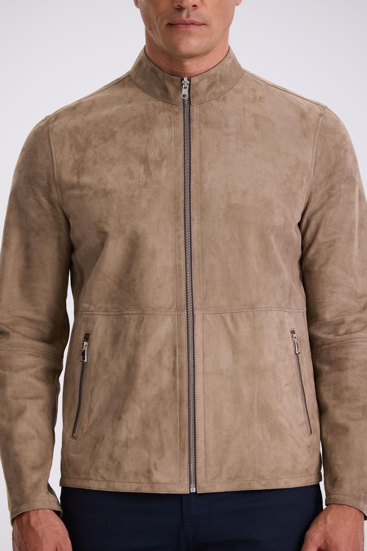 Bej Comfort Fit Dik Yaka Çift Taraflı %100 Deri Mont