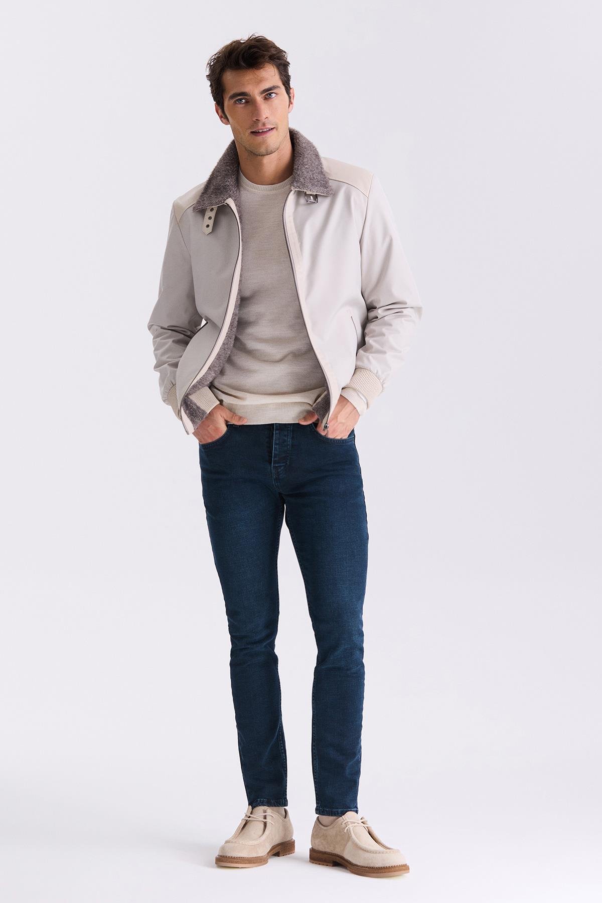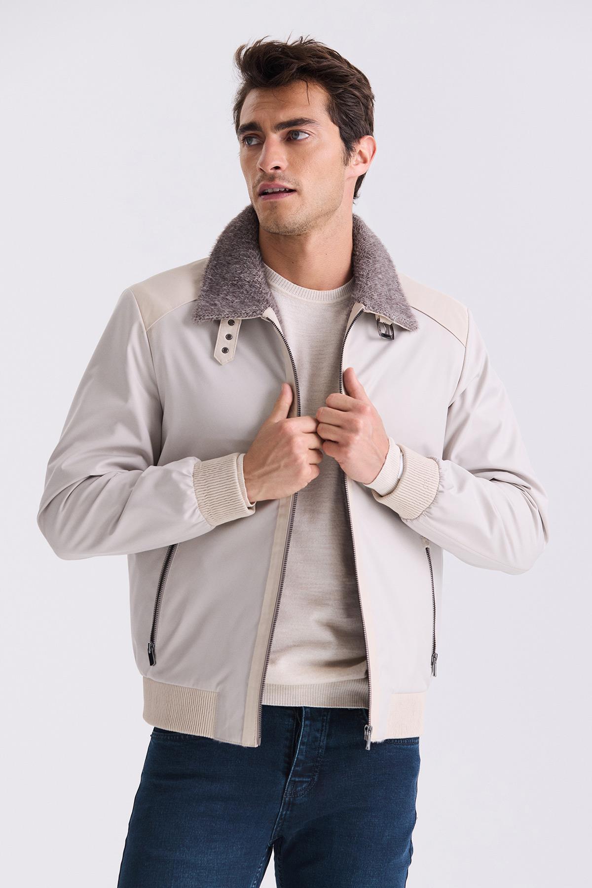 Bej Comfort Fit Kürklü Yaka Önü Fermuarlı Hakiki Deri detaylı Mont