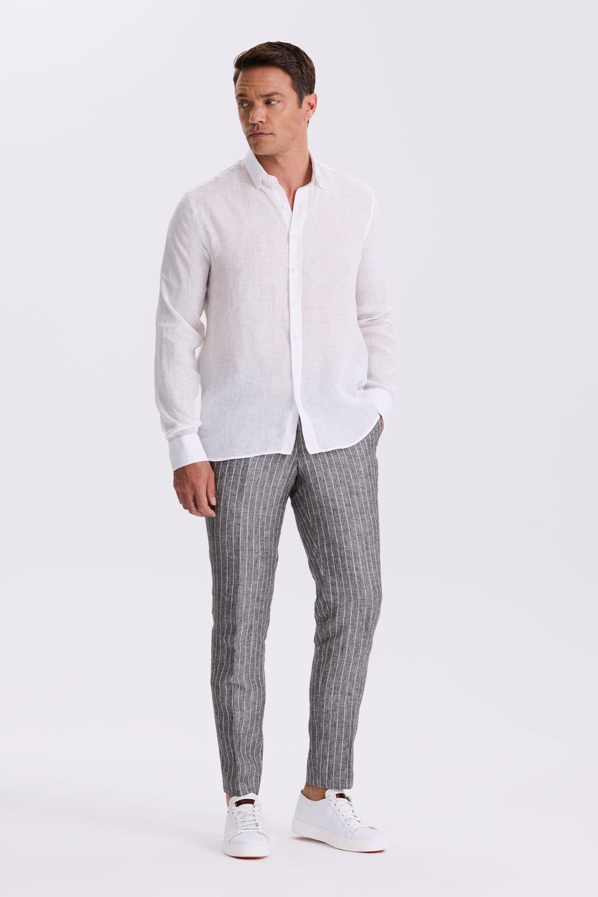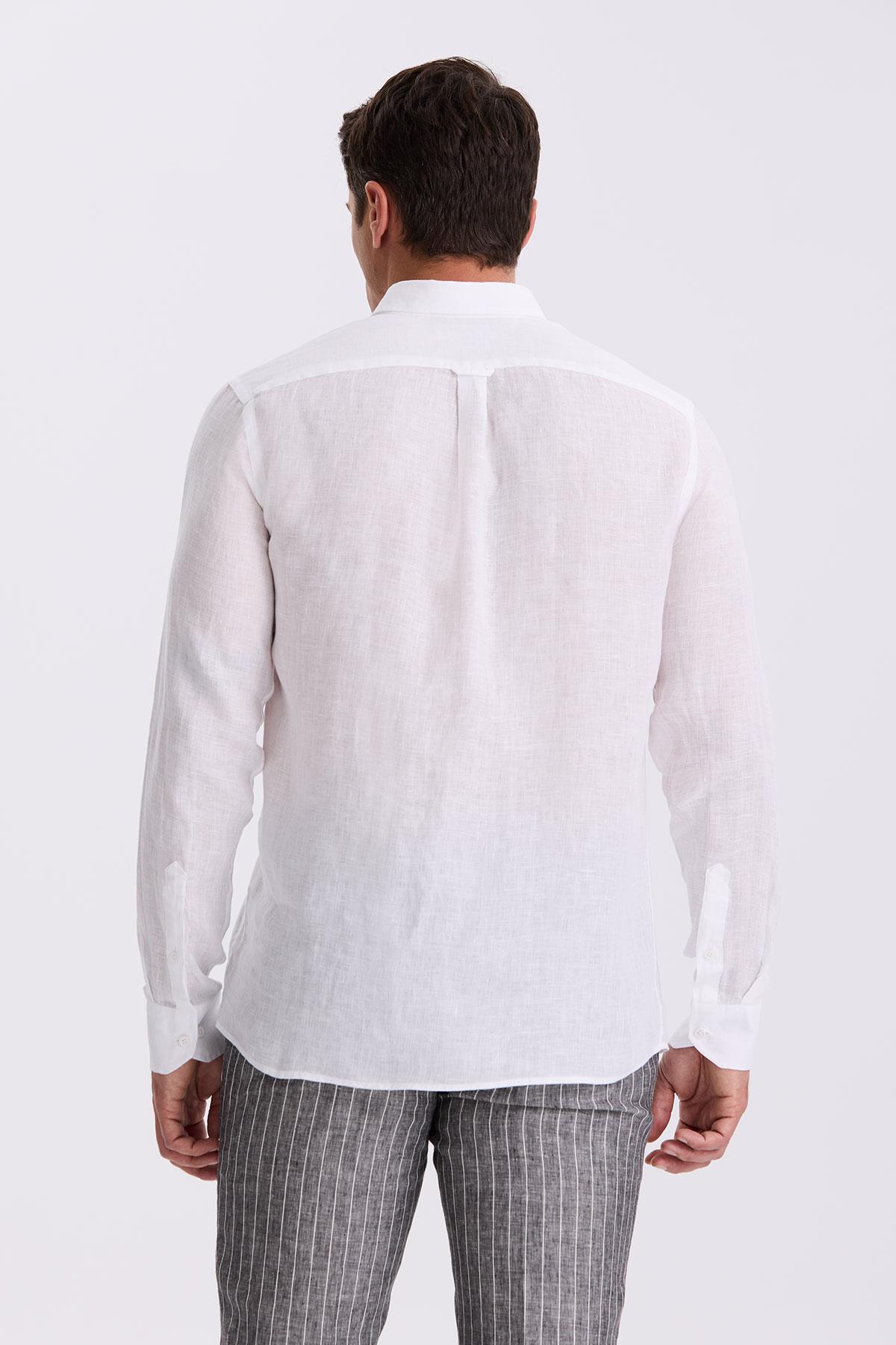 Beyaz %100 Keten Düğmeli Yaka Comfort Fit Gömlek
