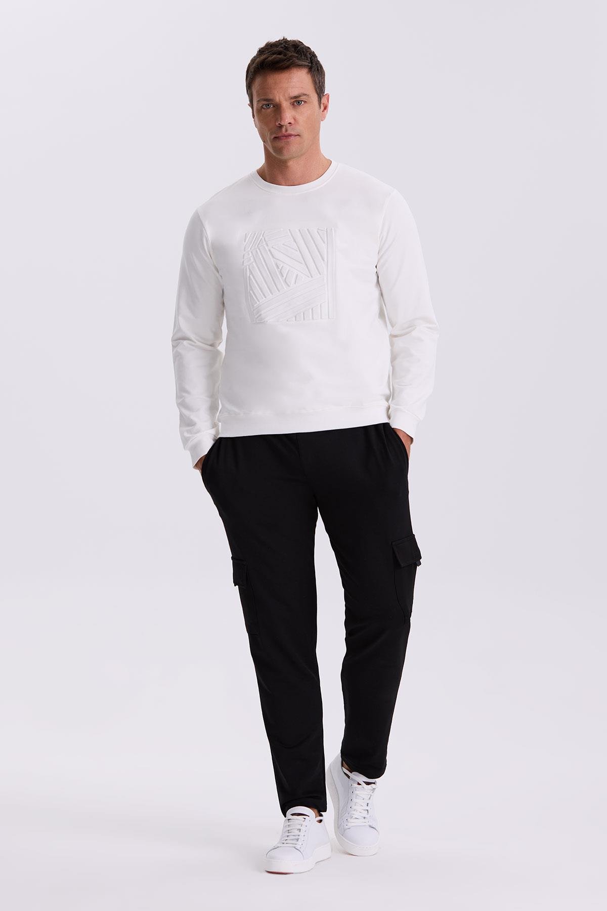 Beyaz Slim Fit Bisiklet Yaka Dar Kesim Baskılı %100 Pamuk Sweatshirt