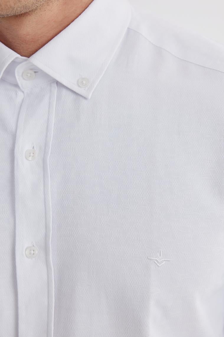 Beyaz Slim Fit Üstten Düğmeli Yaka Desenli Pamuklu Gömlek
