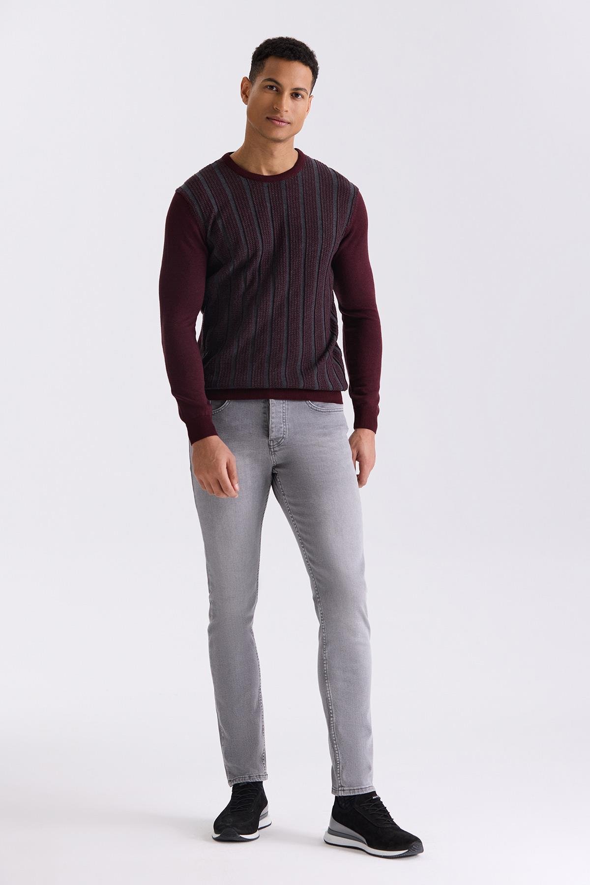 Bordo Slim Fit Bisiklet Yaka Çizgi Desenli Triko Kazak