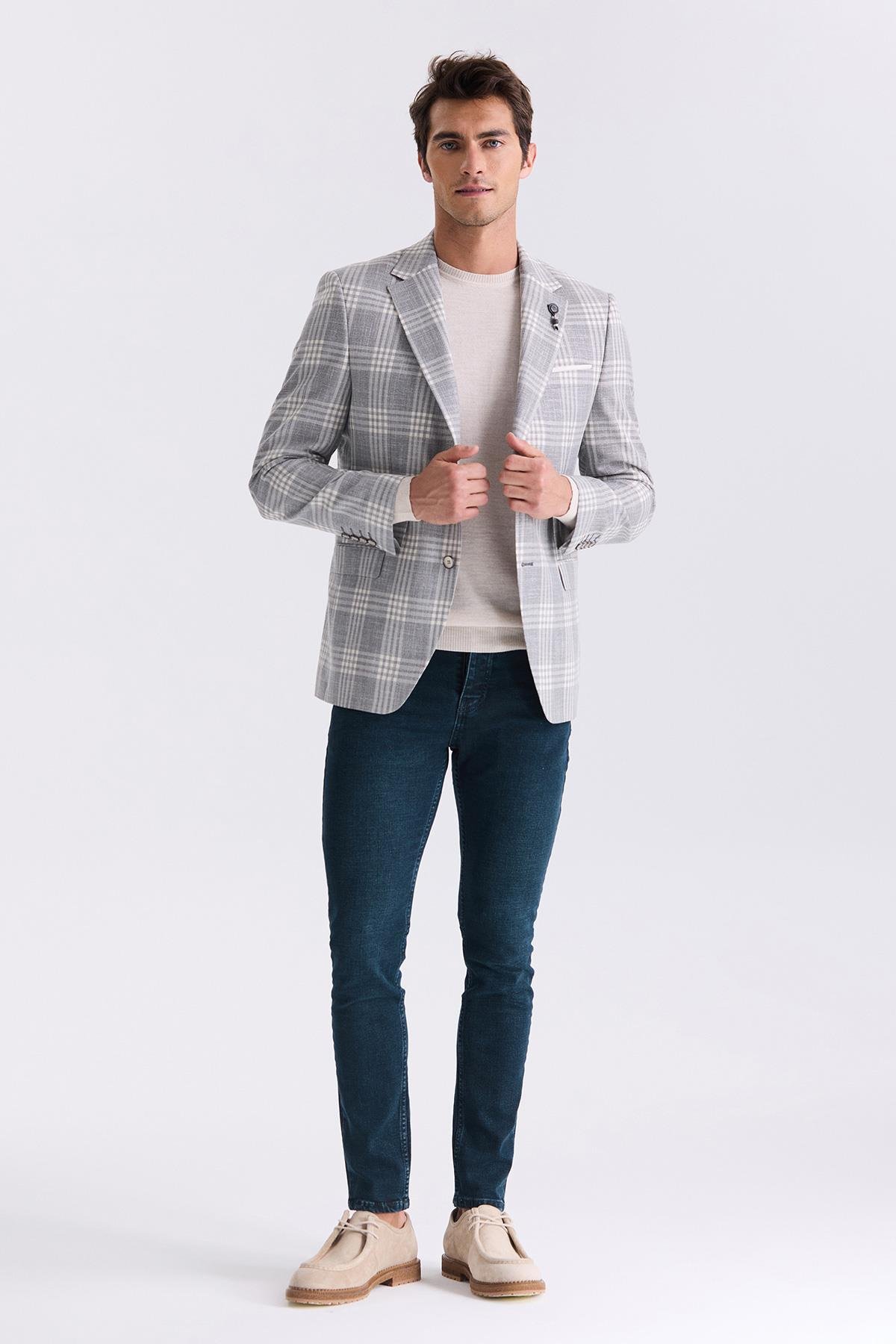 Gri Klasik Kalıp Kareli Mono Yaka Ceket