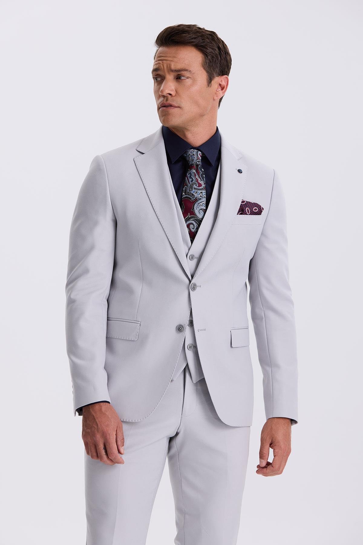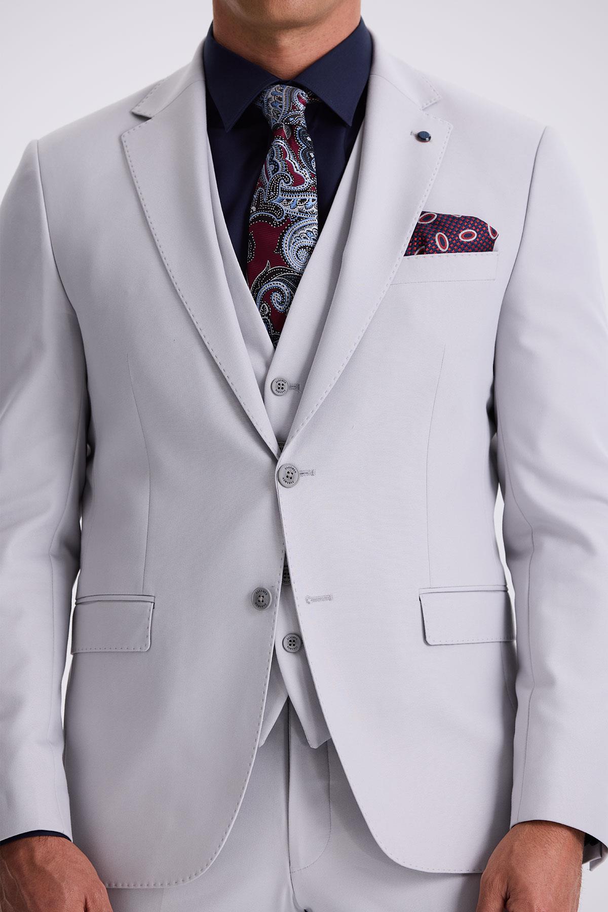 Gri Slim Fit Mono Yaka Çift Yırtmaçlı Yelekli Takım Elbise