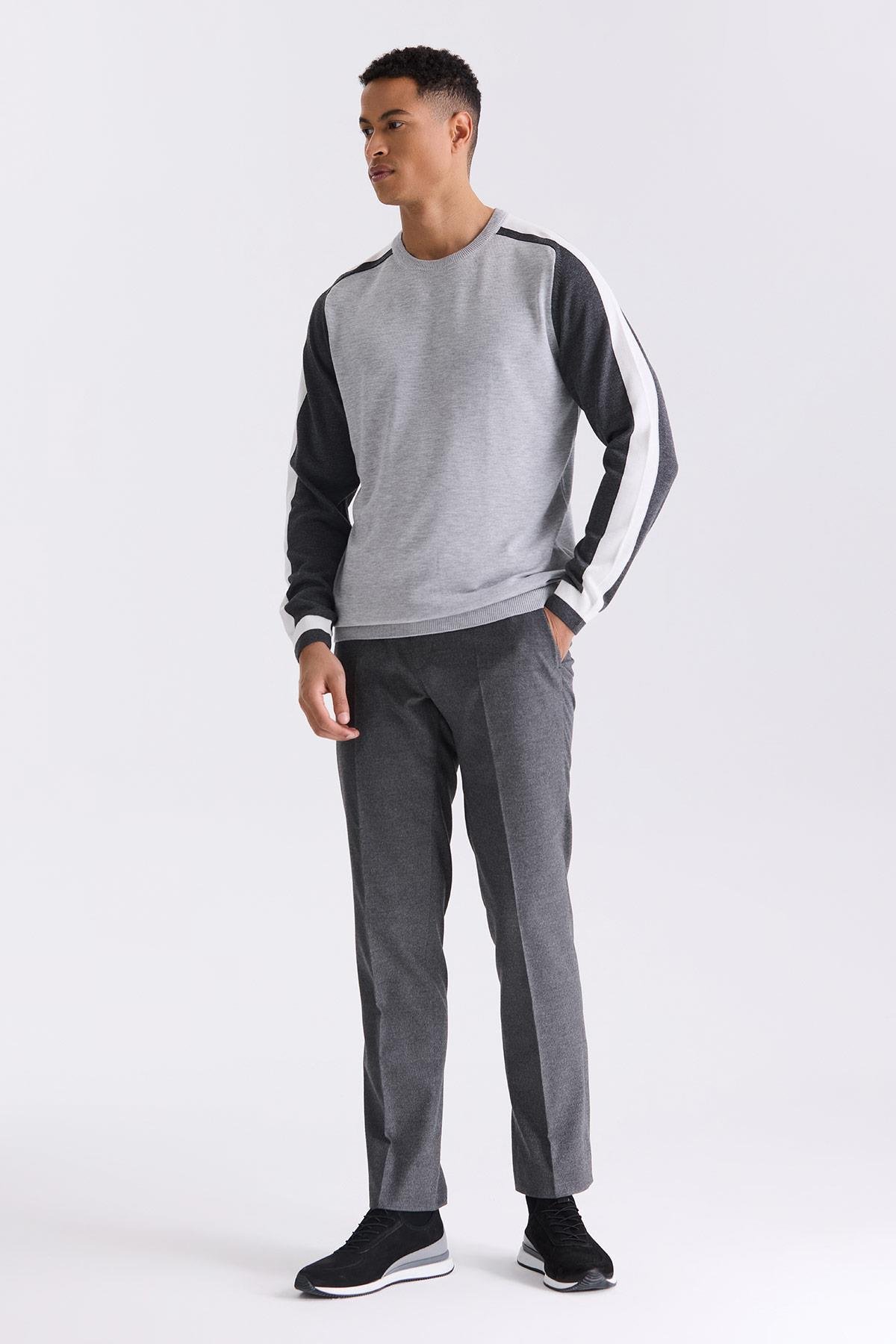 Gri Slim Fit Şerit Detaylı Bisiklet Yaka Triko Kazak