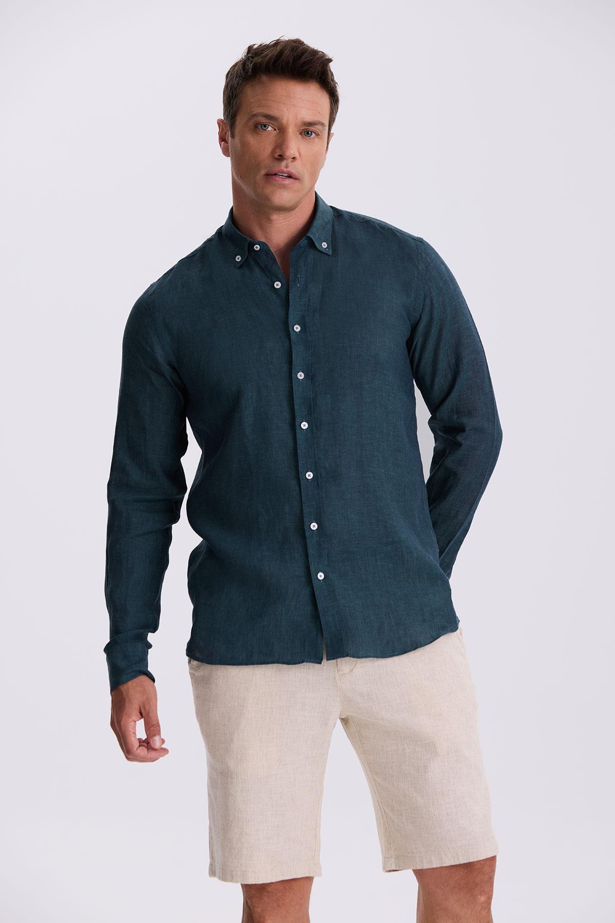 Haki %100 Keten Düğmeli Yaka Comfort Fit Gömlek