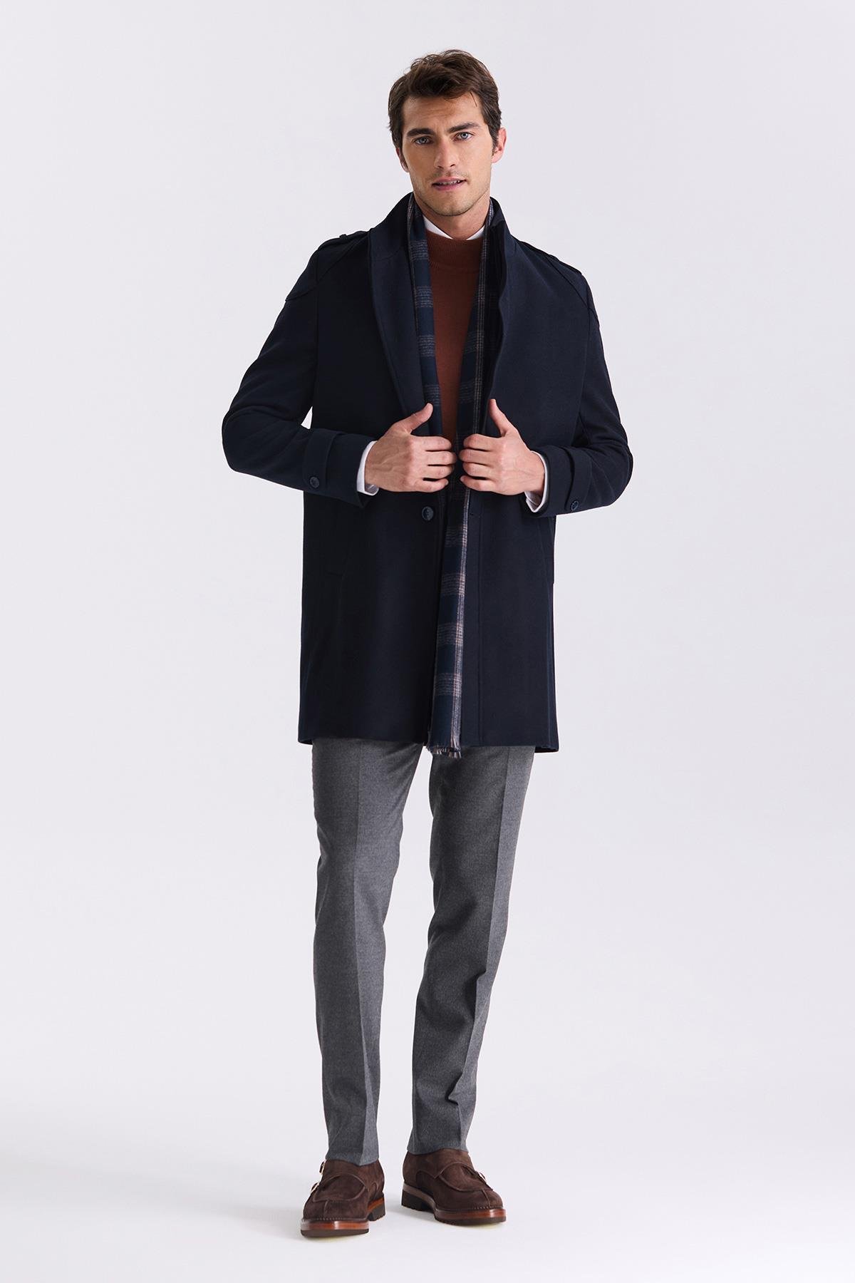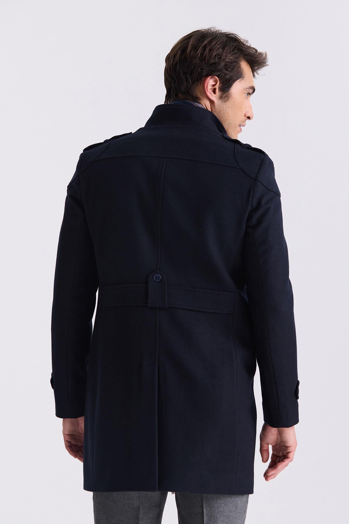 Koyu Lacivert Regular Fit Hakim Yaka Apoletli Yünlü Kaşe Kaban