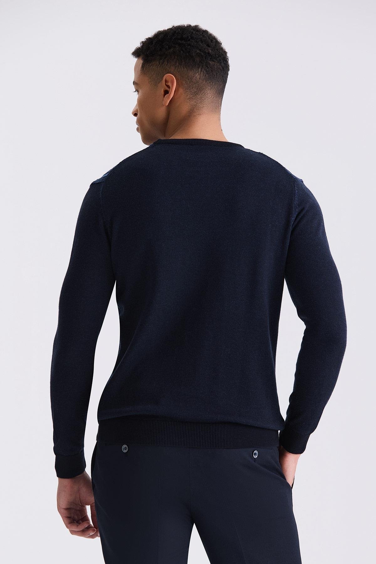Lacivert / İndigo Slim Fit Bisiklet Yaka Çizgi Desenli Triko Kazak