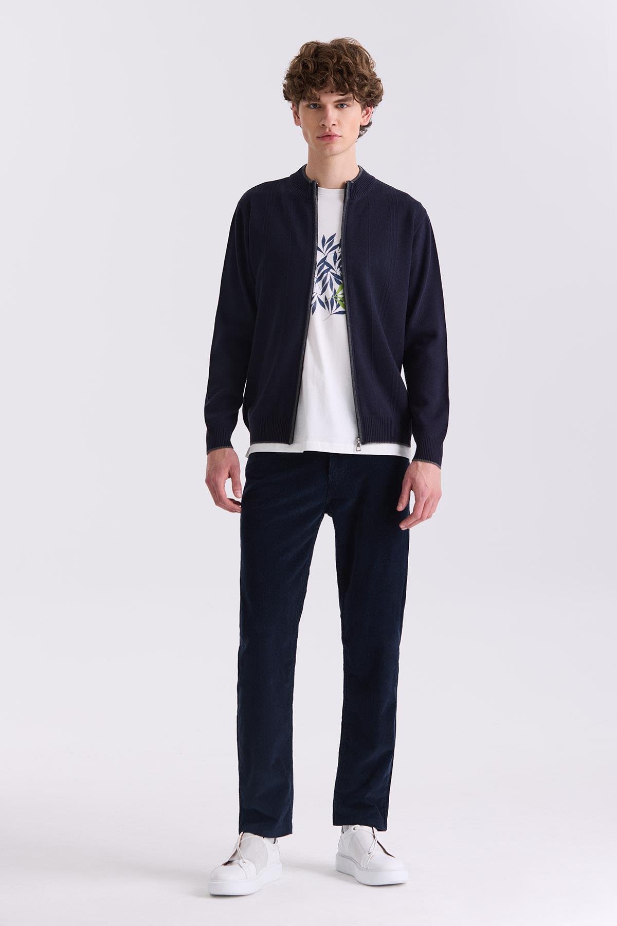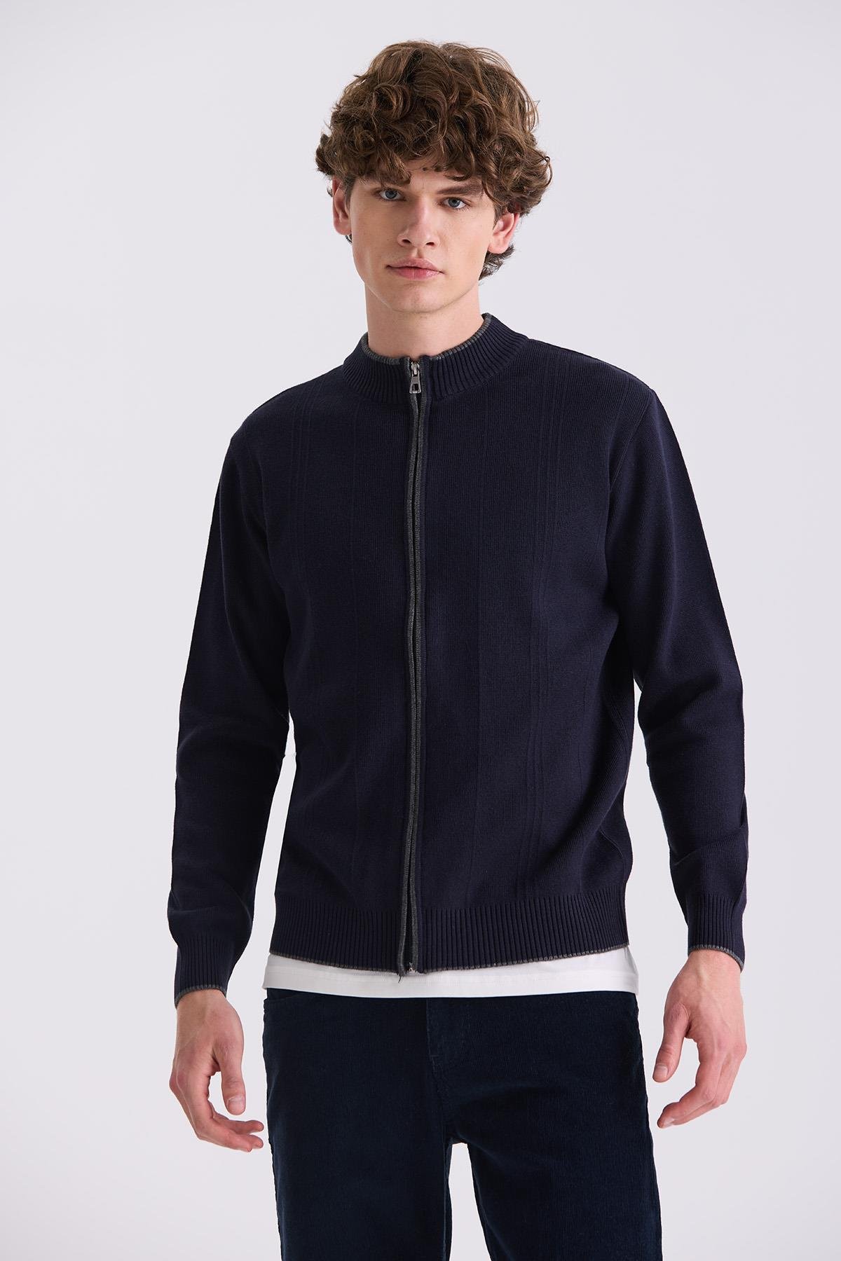 Lacivert Classic Fit Düz Fermuarlı Dik Yaka Triko Hırka