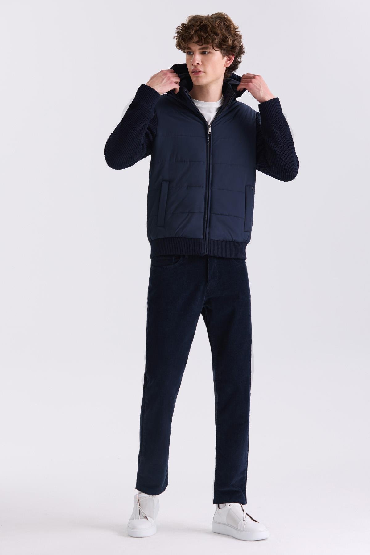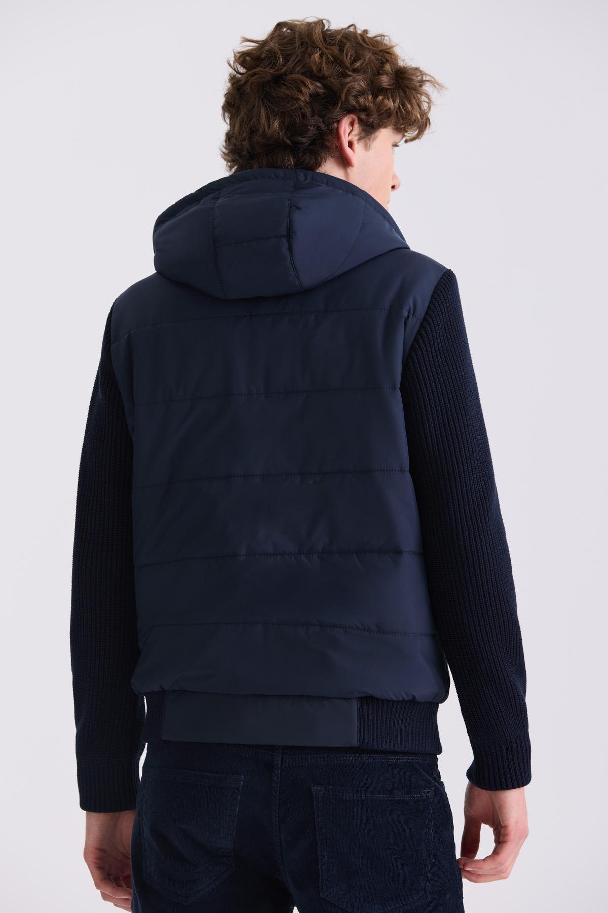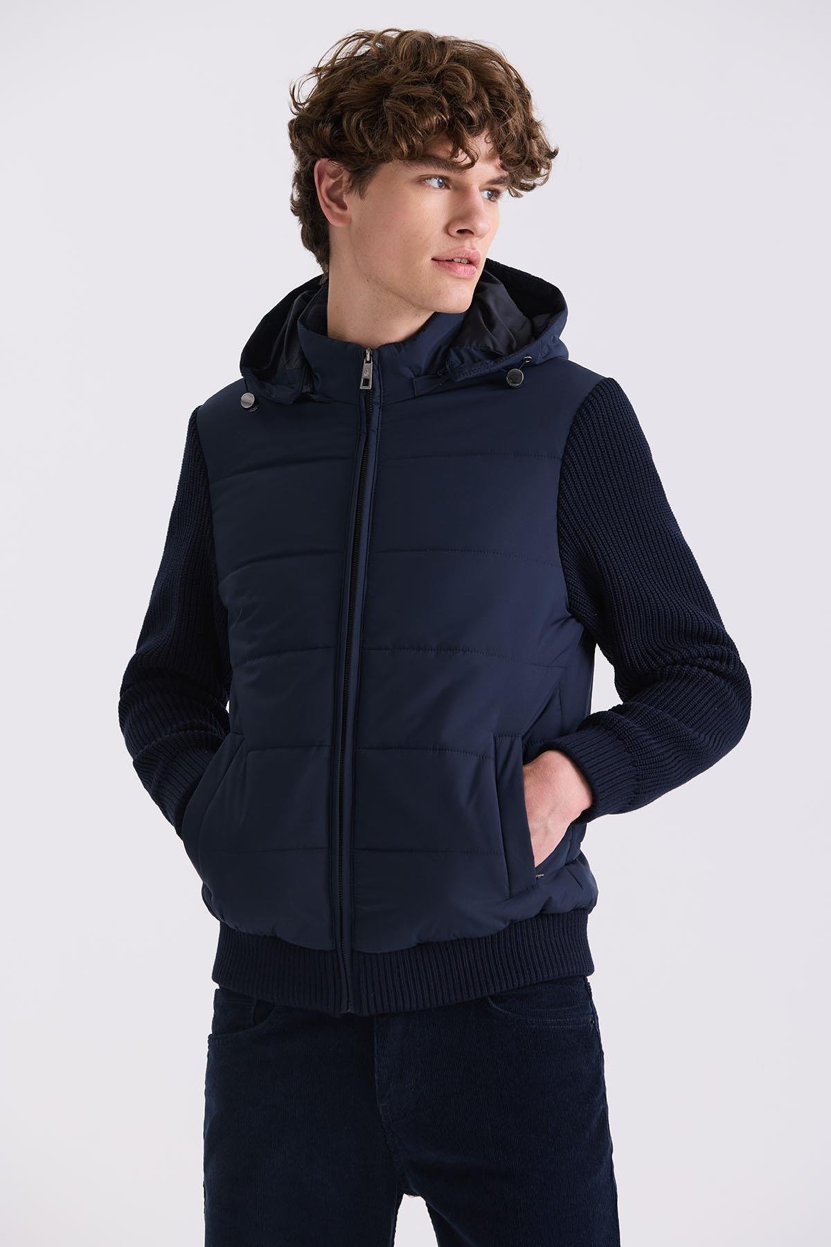 Lacivert Comfort Fit Kapüşonlu Kolları Triko Kışlık Mont