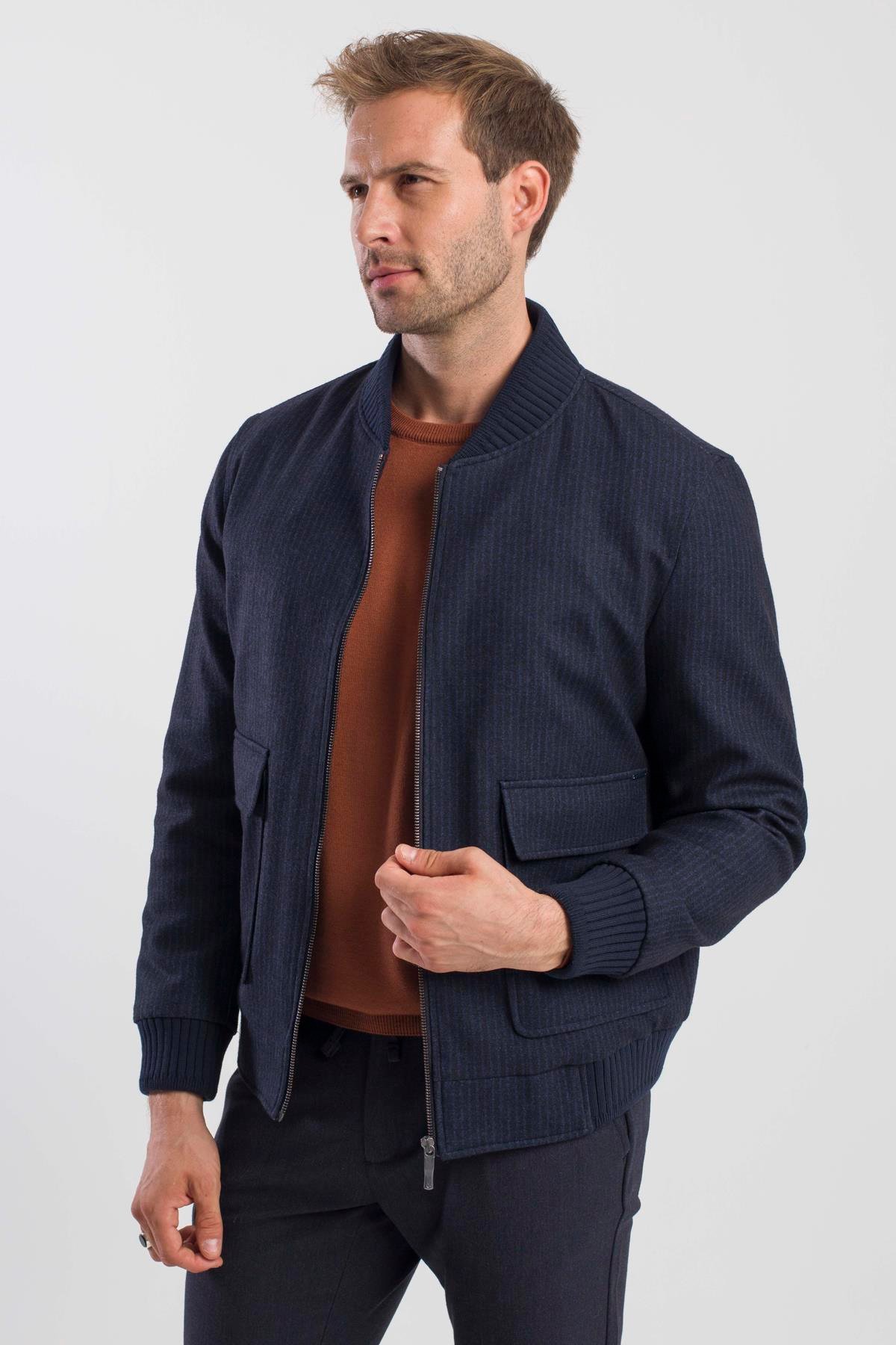 Lacivert Comfort Fit Kolej Yaka Çizgili Mont