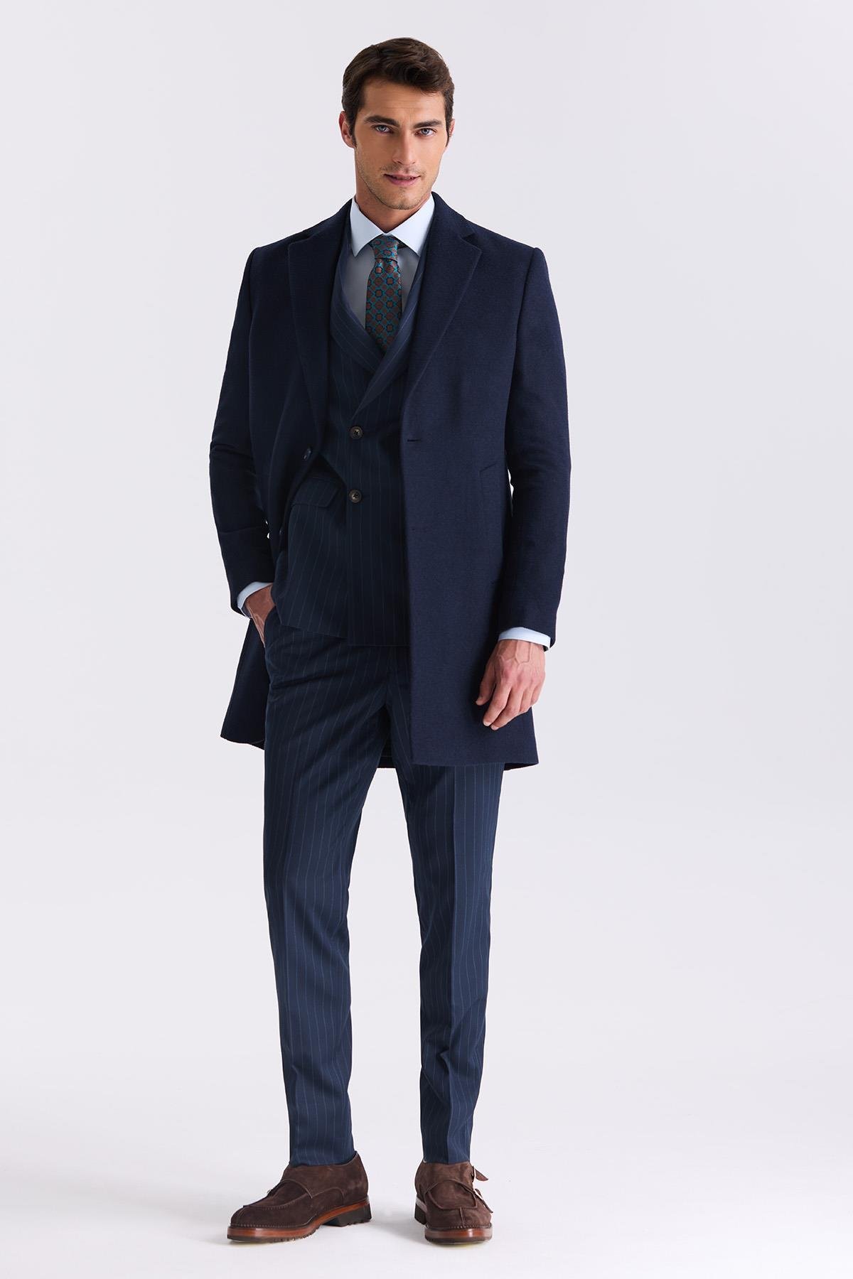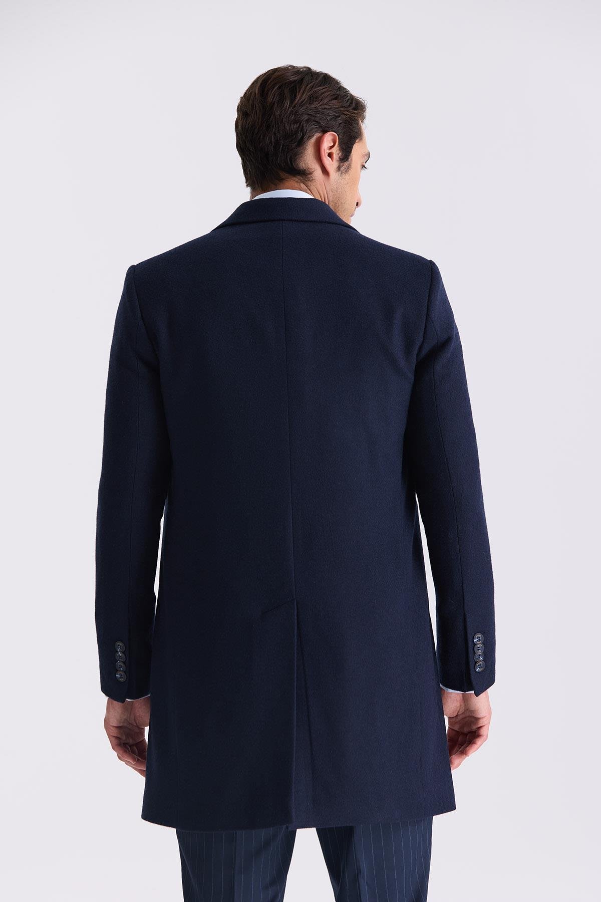Lacivert Comfort Fit Mono Yaka Yan Cep Kaşe Kaban