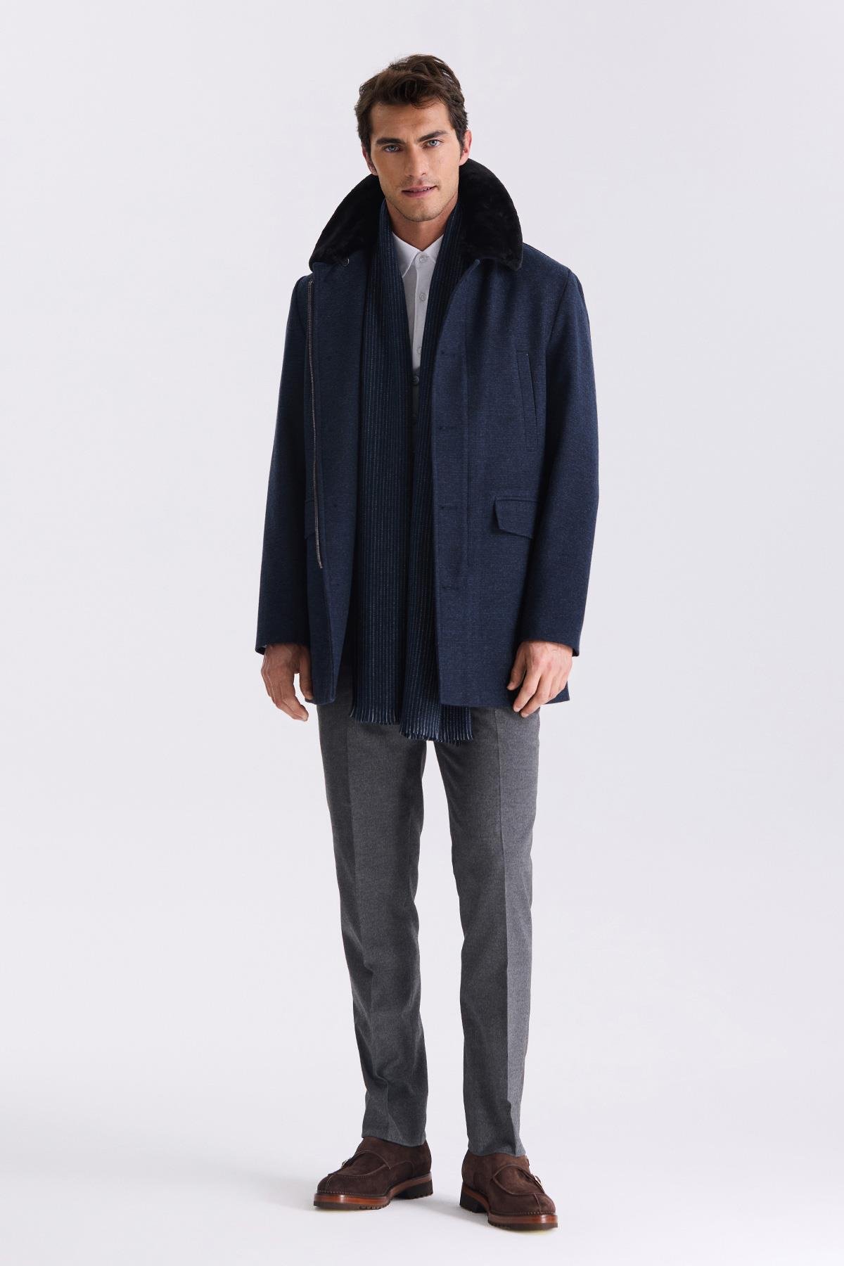 Lacivert Regular Fit Çıkarılabilir Kürklü Yaka Desenli Yünlü Kaban