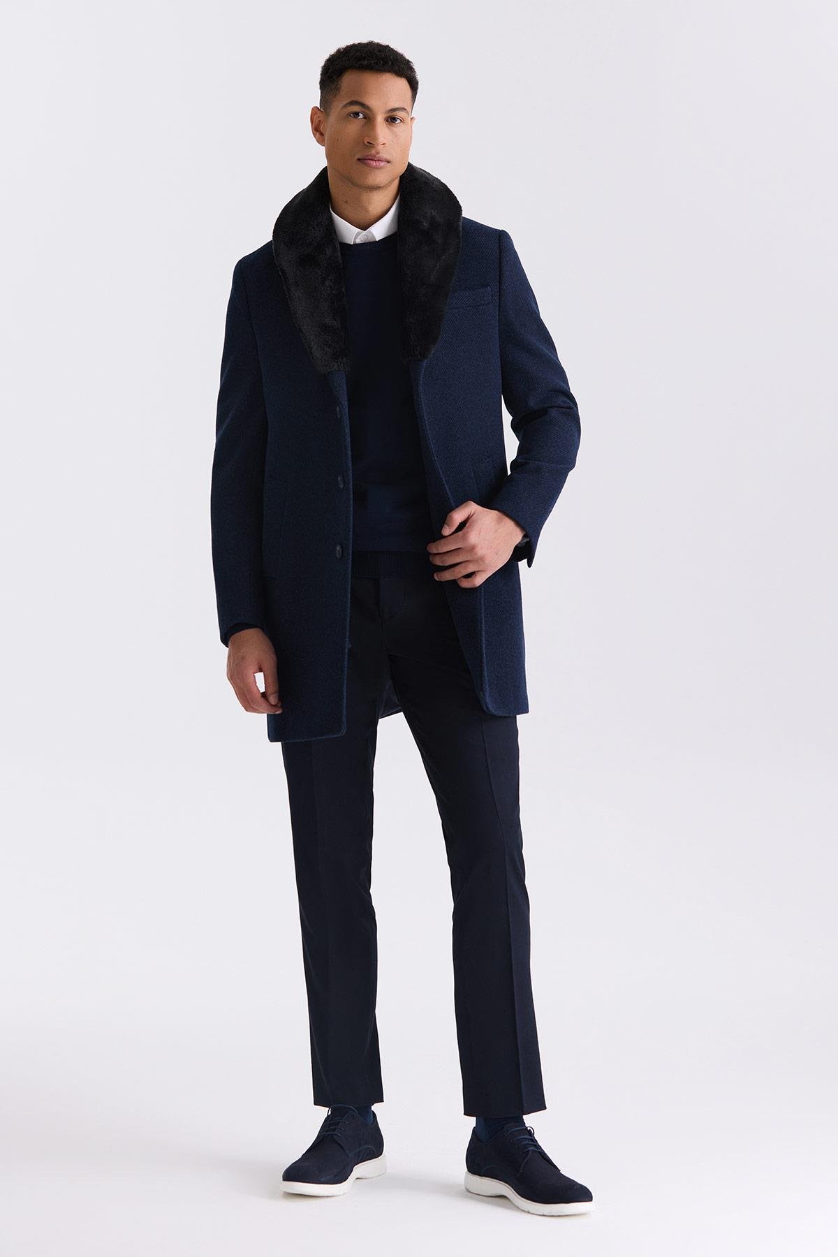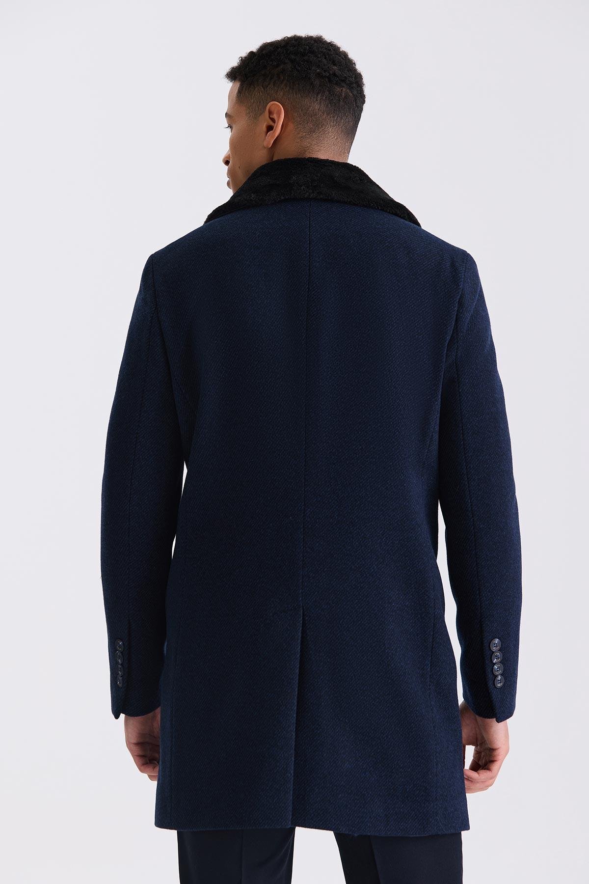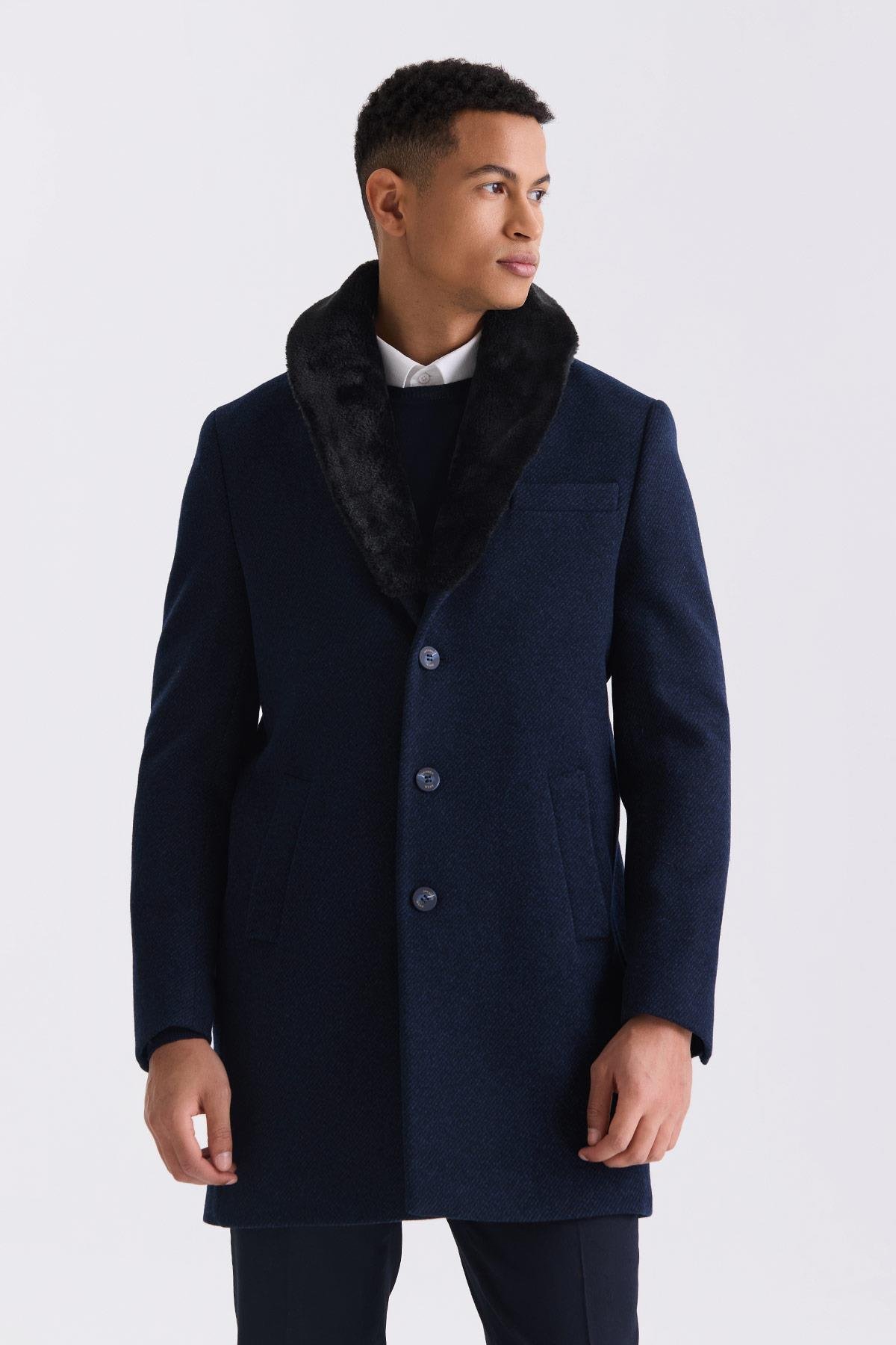 Lacivert Regular Fit Çıkarılabilir Yaka Yünlü Kaşe Kaban