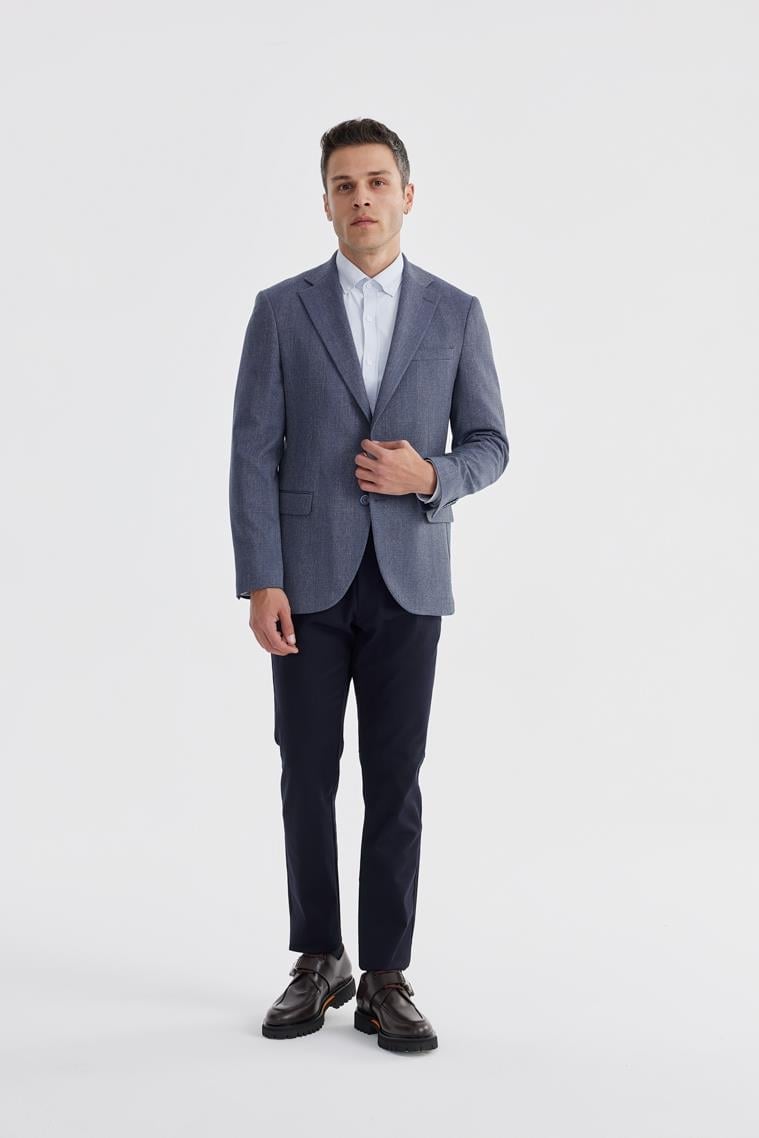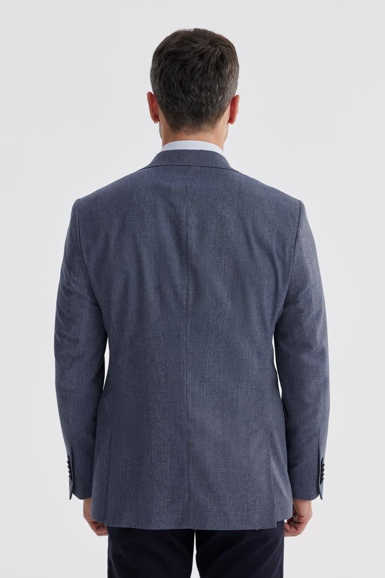 Lacivert Slim Fit Ekose Kareli Çift Yırtmaçlı Ceket