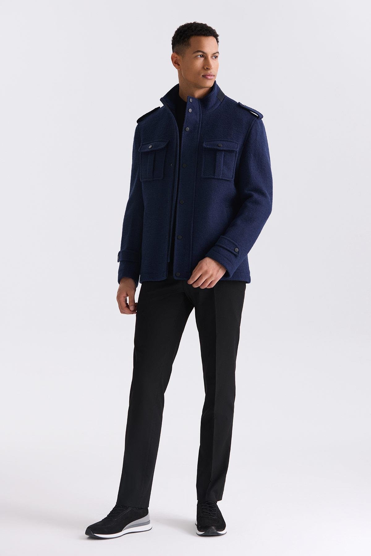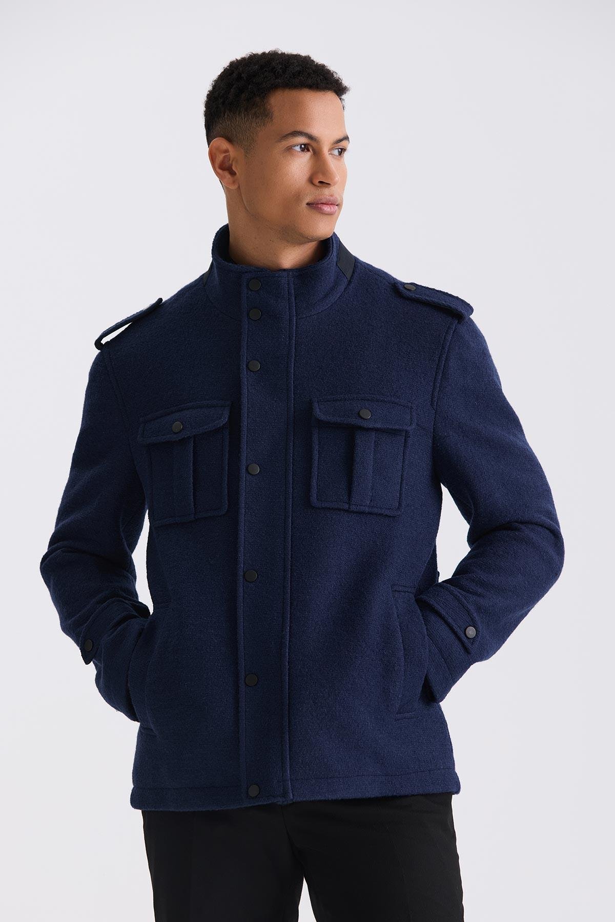 Lacivert Slim Fit Hakim Yaka Apoletli Desenli Spor Kaşe Kaban