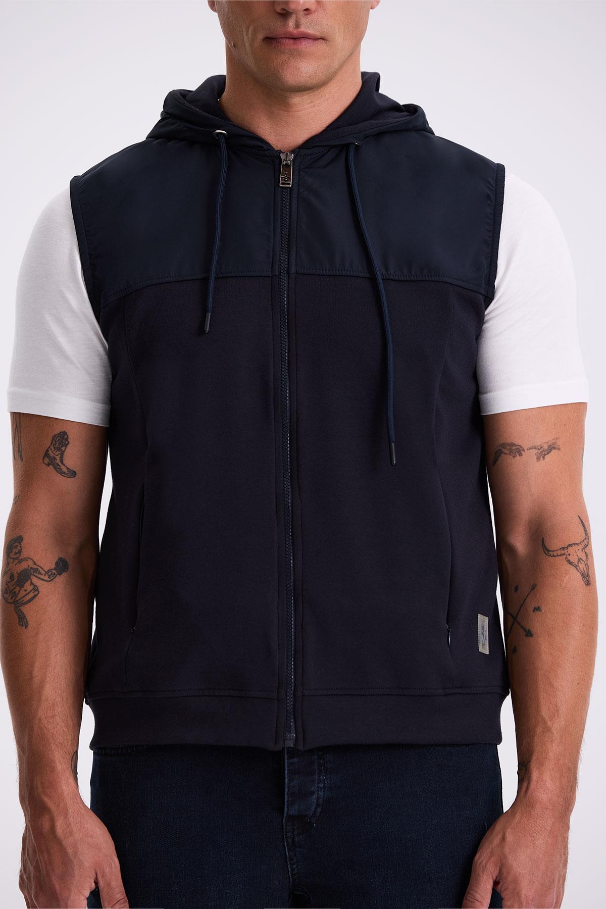 Lacivert Slim Fit Kapüşonlu Pamuklu Likralı Yelek