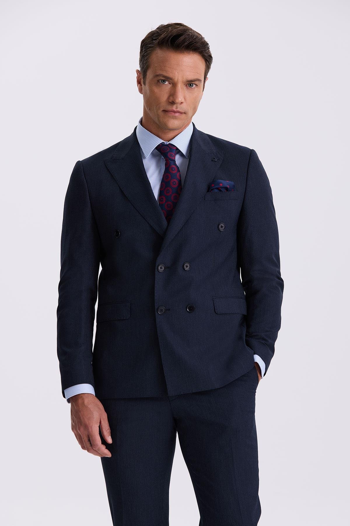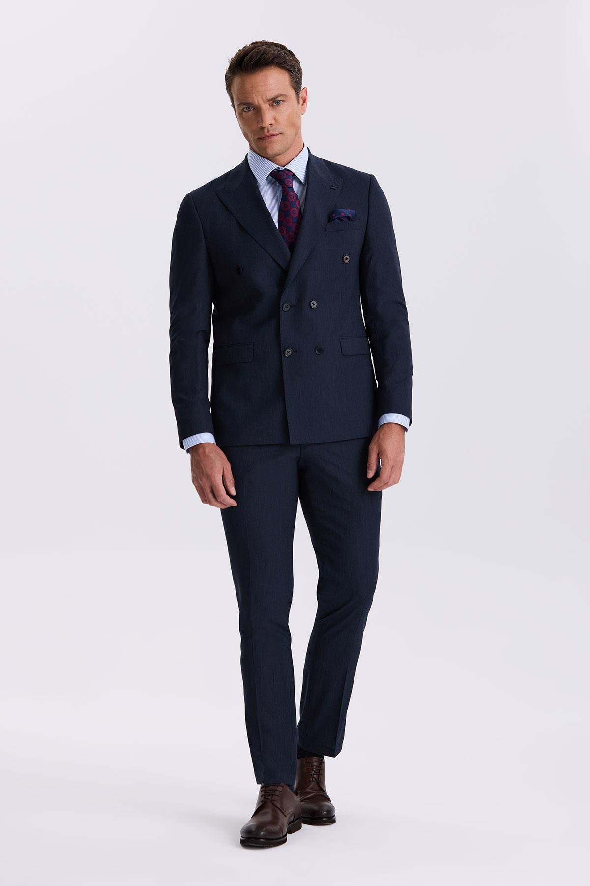 Lacivert Slim Fit Kırlangıç Yaka Çift Yırtmaç Yünlü Kruvaze Takım Elbise