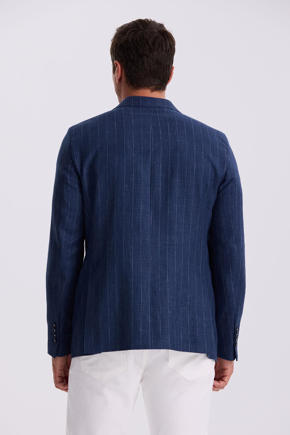 Lacivert Slim Fit Kırlangıç Yaka Çizgili Keten Pamuk Mevsimlik Ceket