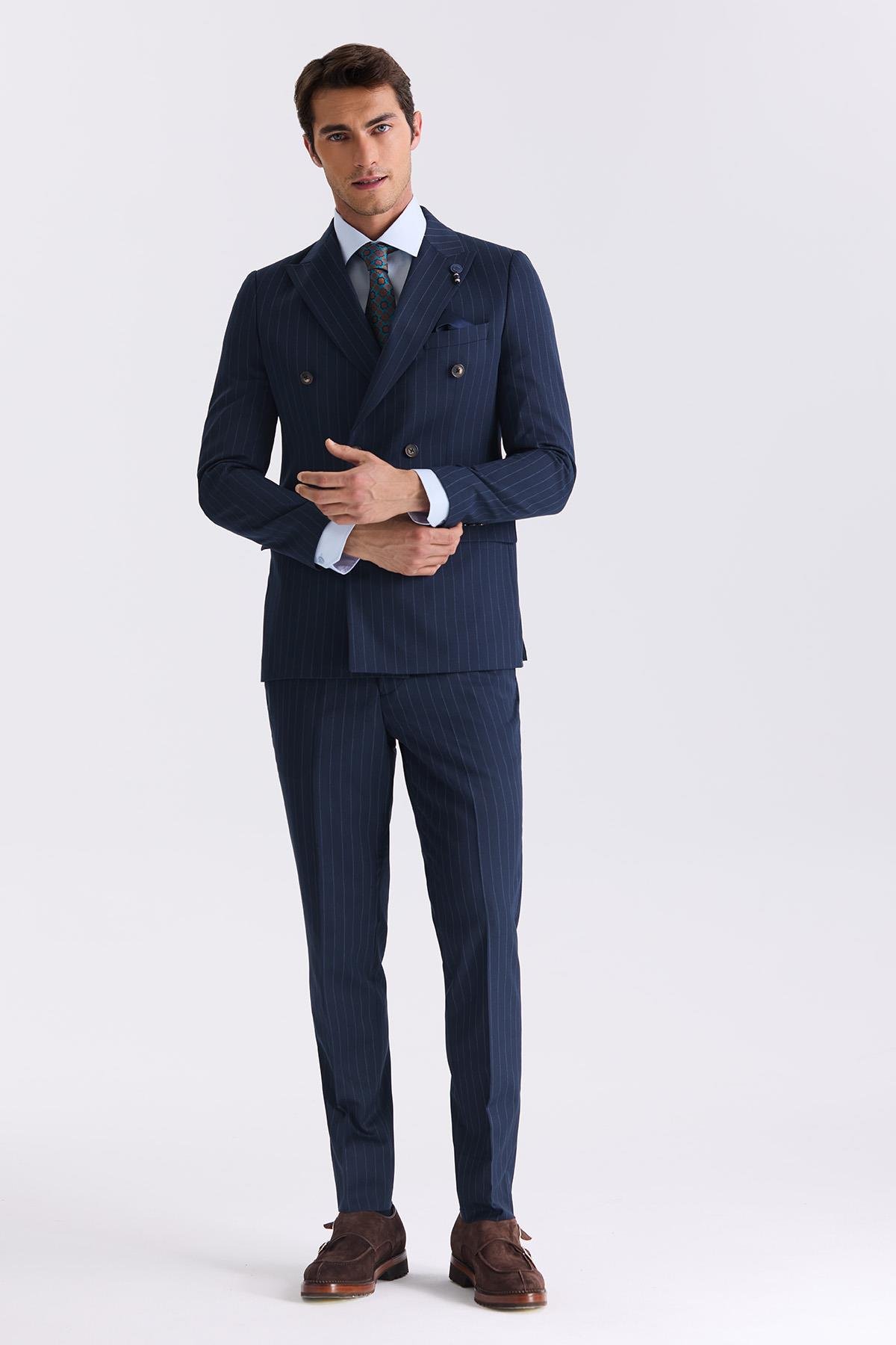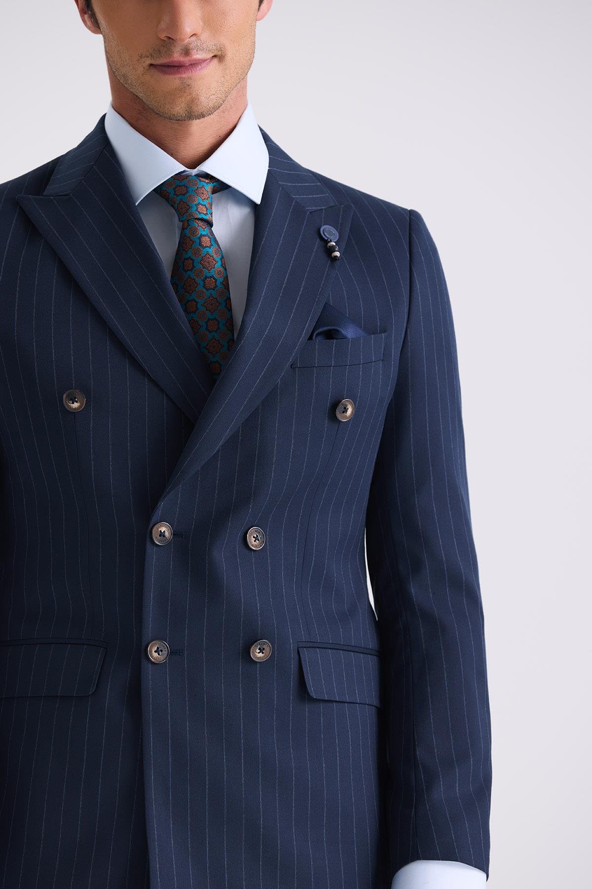 Lacivert Slim Fit Sivri Yaka Çizgili Kruvaze Takım Elbise