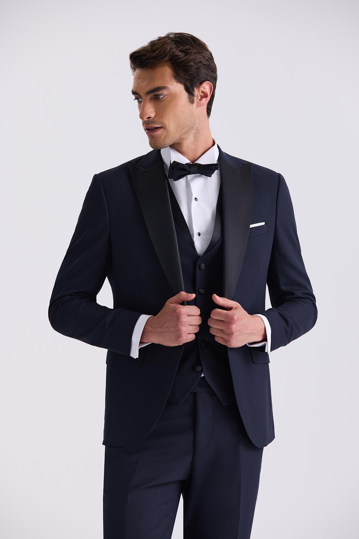 Lacivert Slim Fit Sivri Yaka Yelekli Smokin Takım Elbise