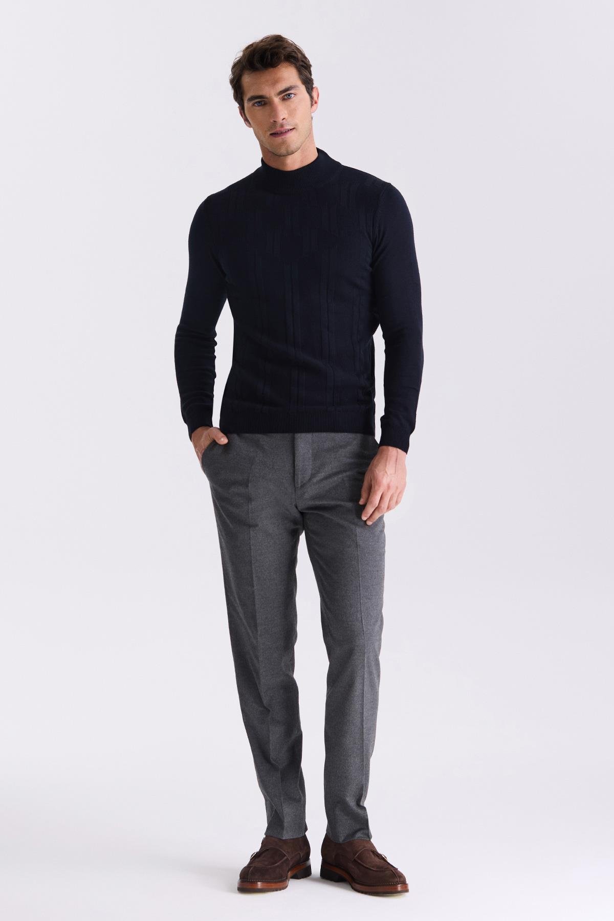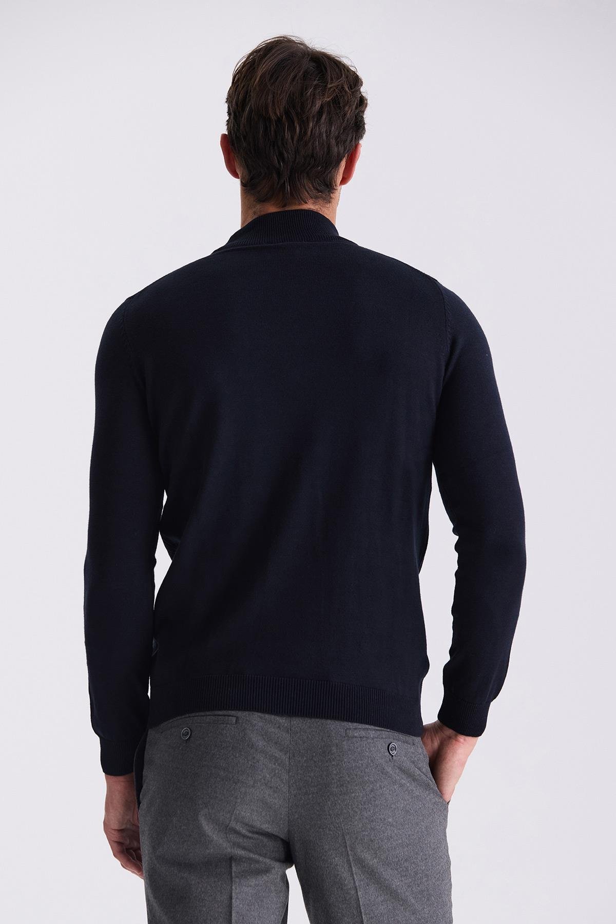 Lacivert Slim Fit Yarım Balıkçı Desenli Triko Kazak