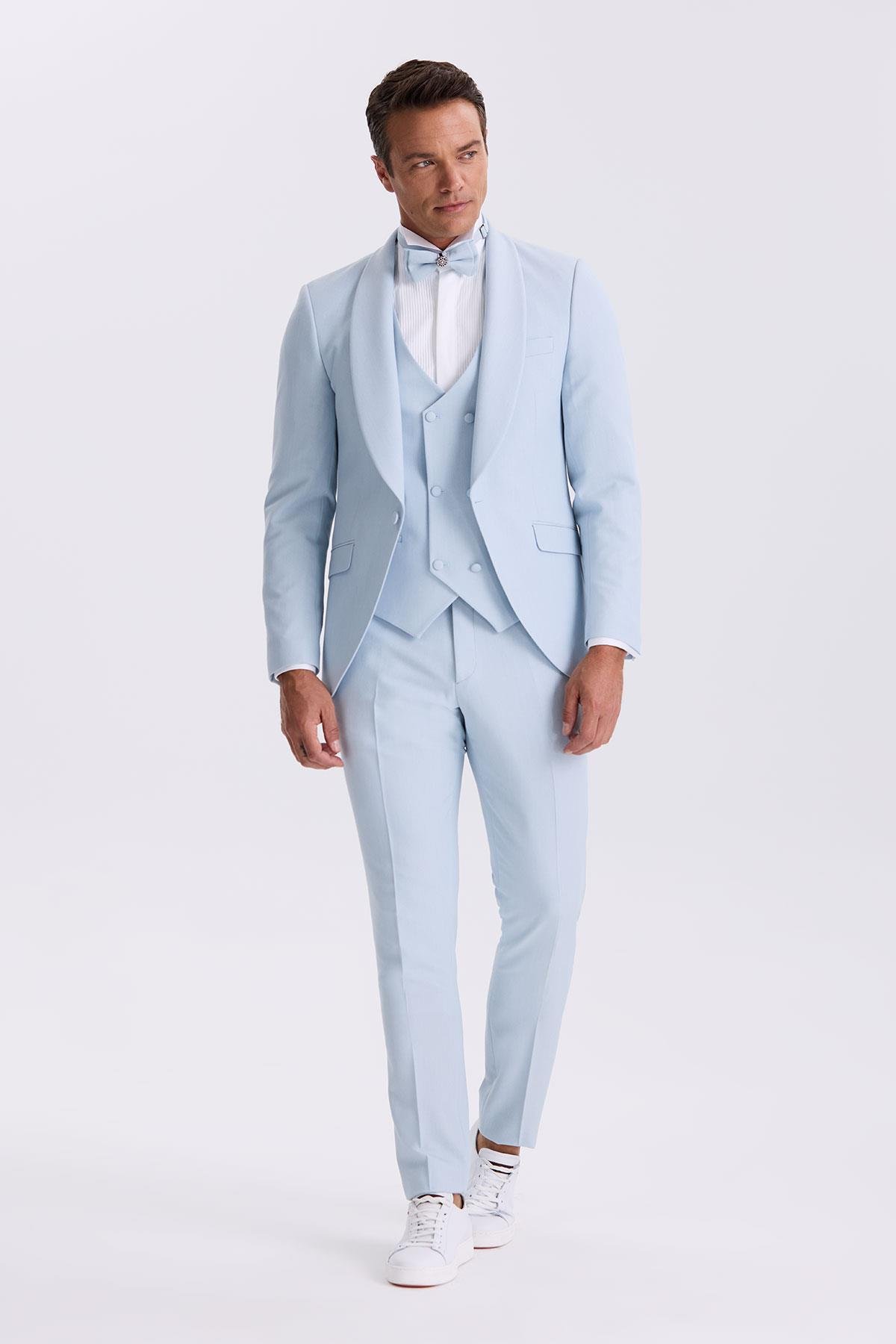 Mavi Slim Fit Şal Yaka Yelekli Smokin Damatlık Takım Elbise