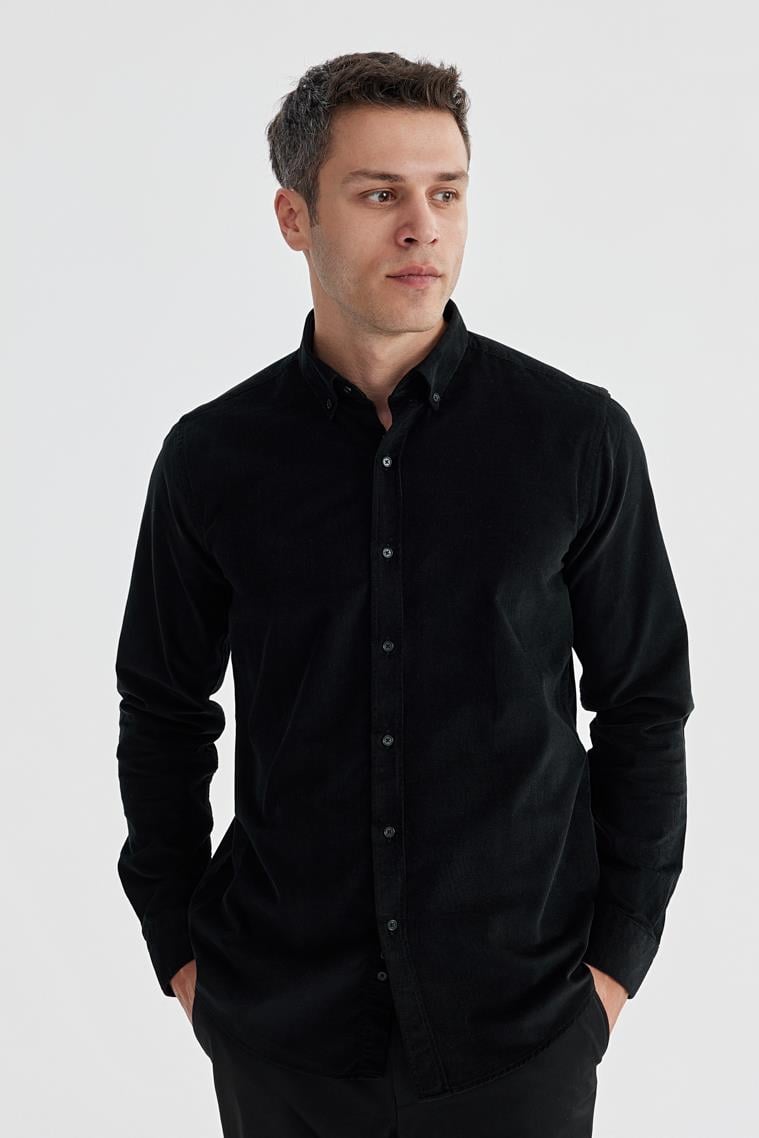 Siyah Comfort Fit Düğmeli Yaka %100 Pamuklu Kadife Gömlek