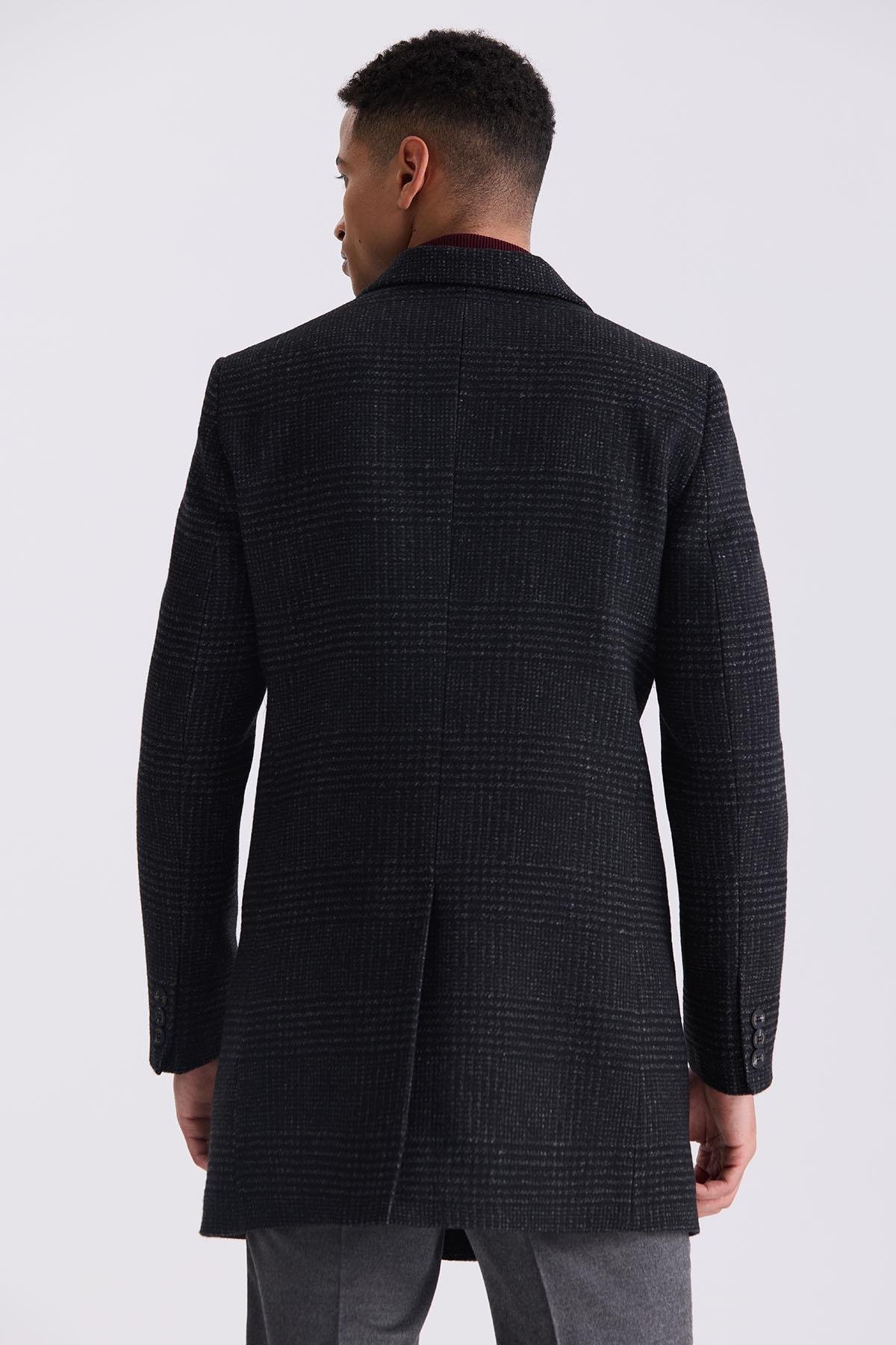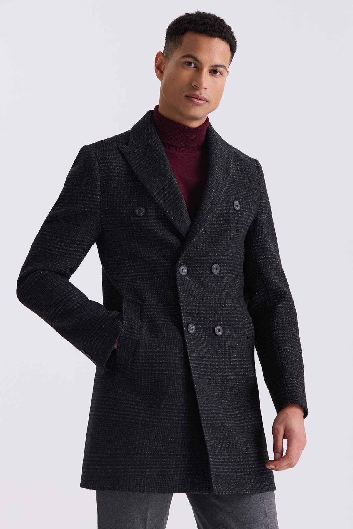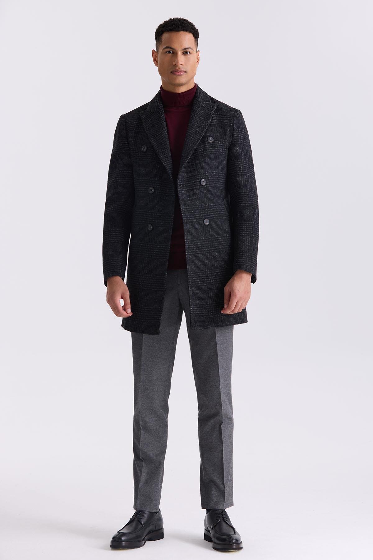 Siyah Comfort Fit Sivri Yaka Ekose Desenli Yünlü Kaban
