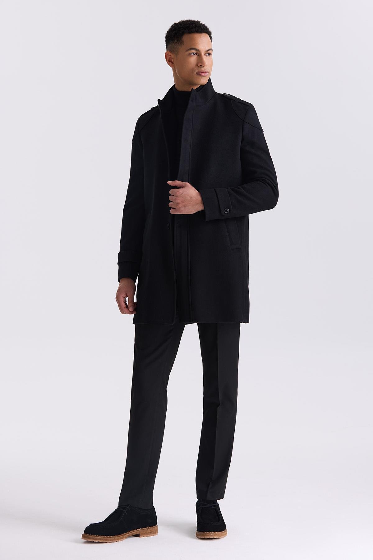 Siyah Regular Fit Hakim Yaka Apoletli Yünlü Kaşe Kaban
