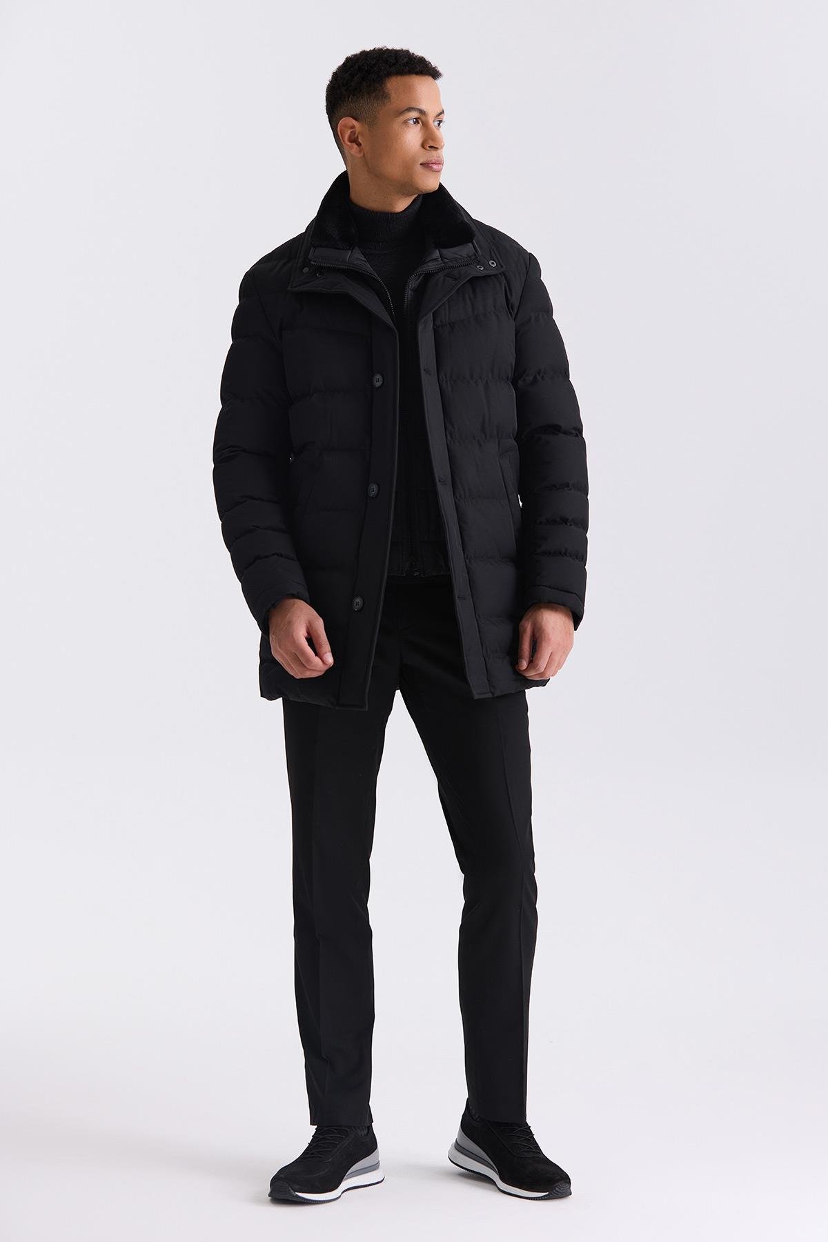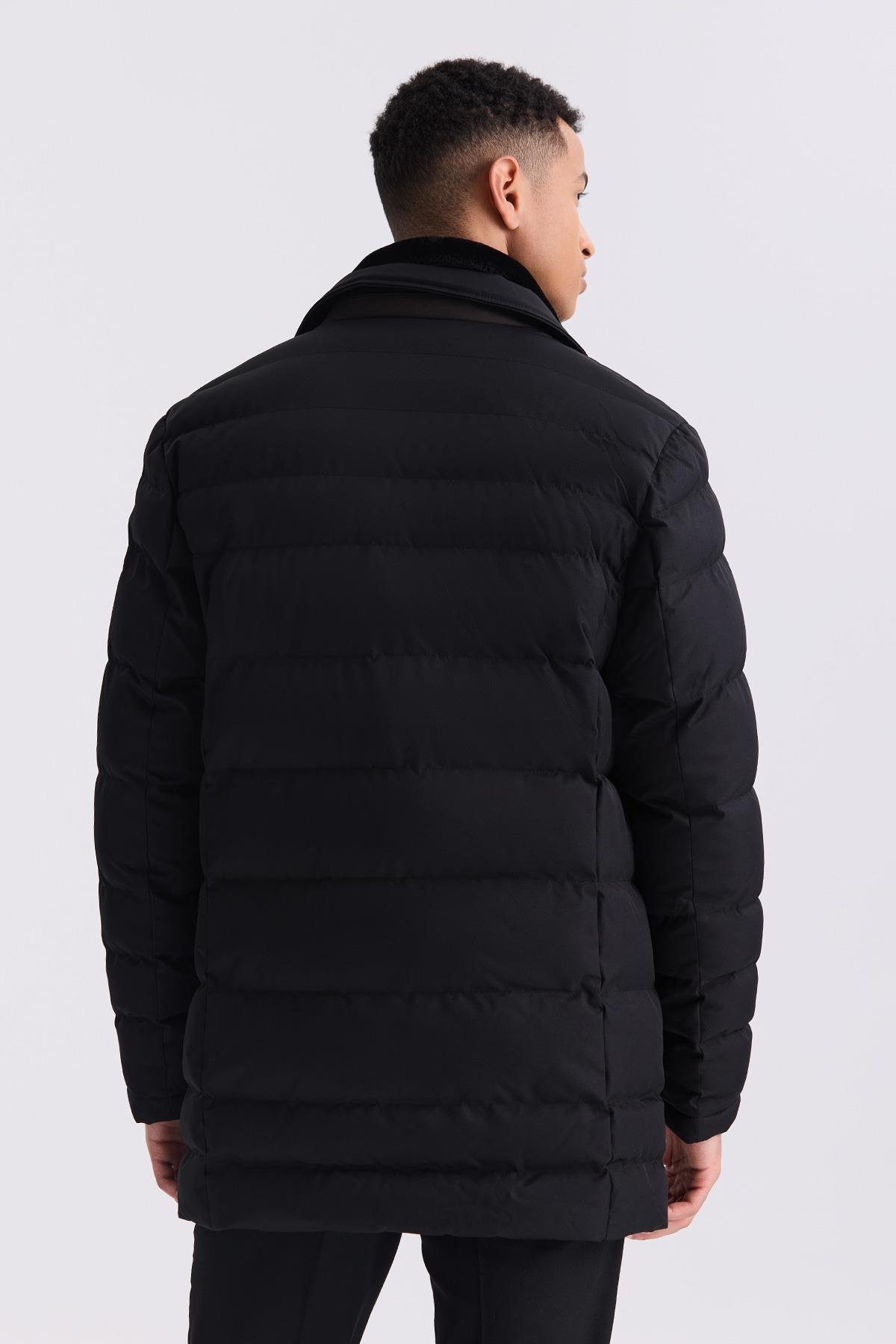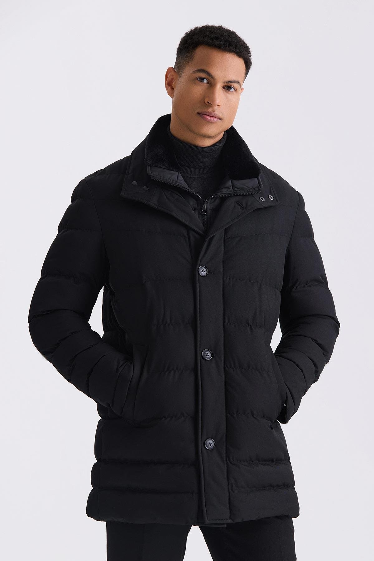 Siyah Regular Fit Yaka Kürklü Düğmeli Şişme Mont