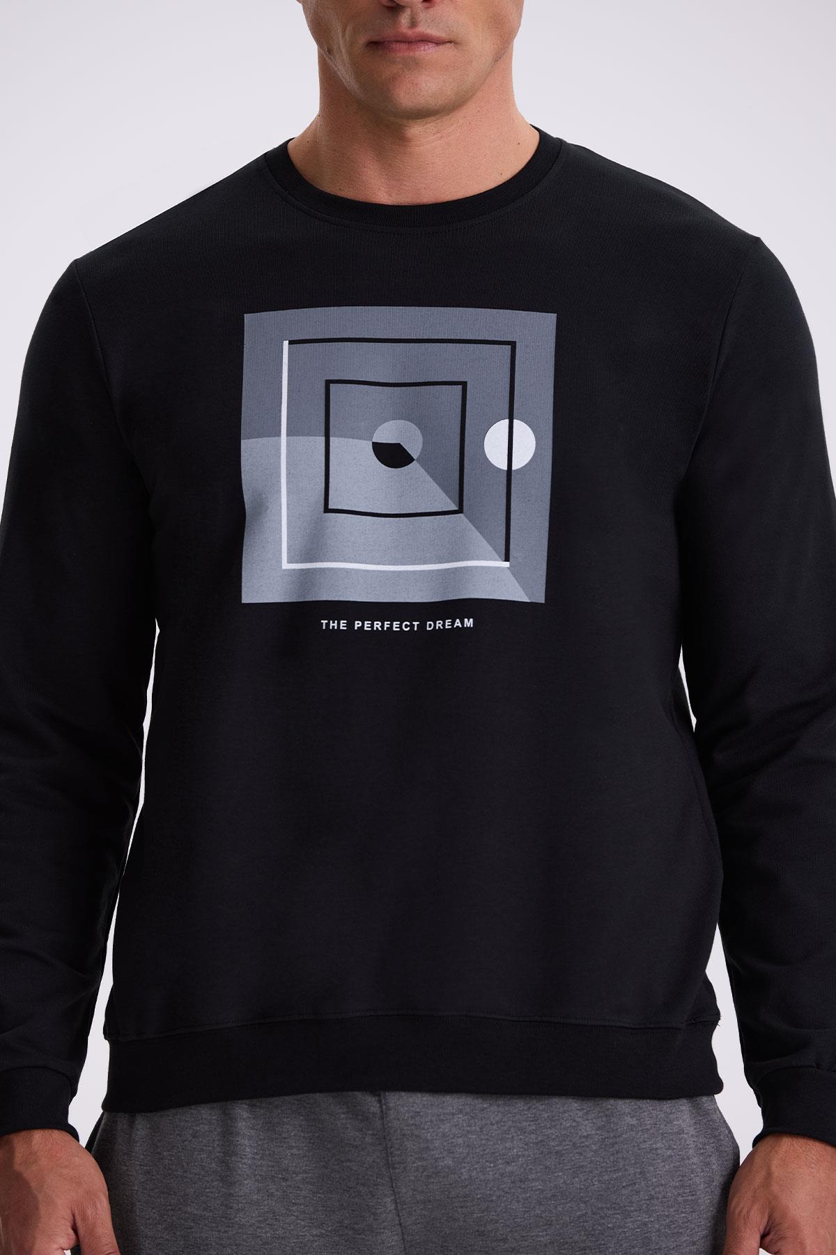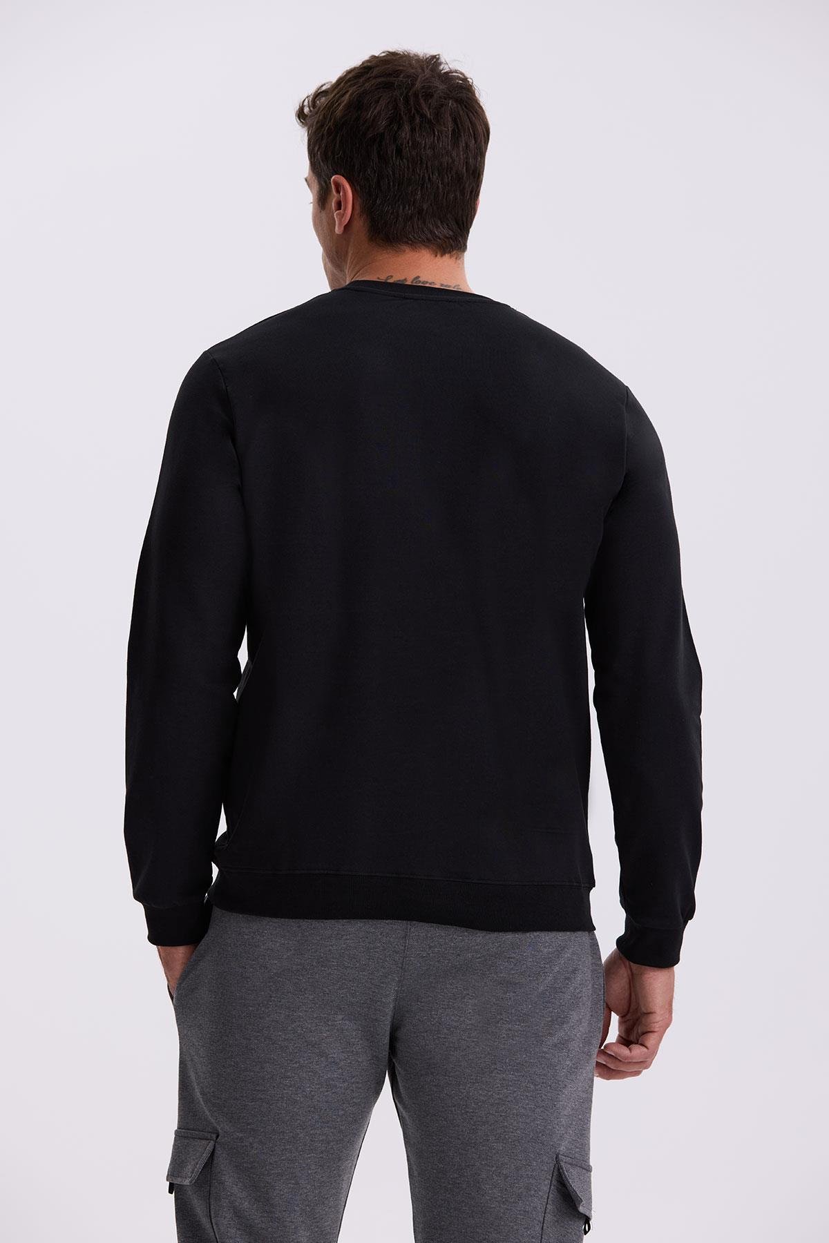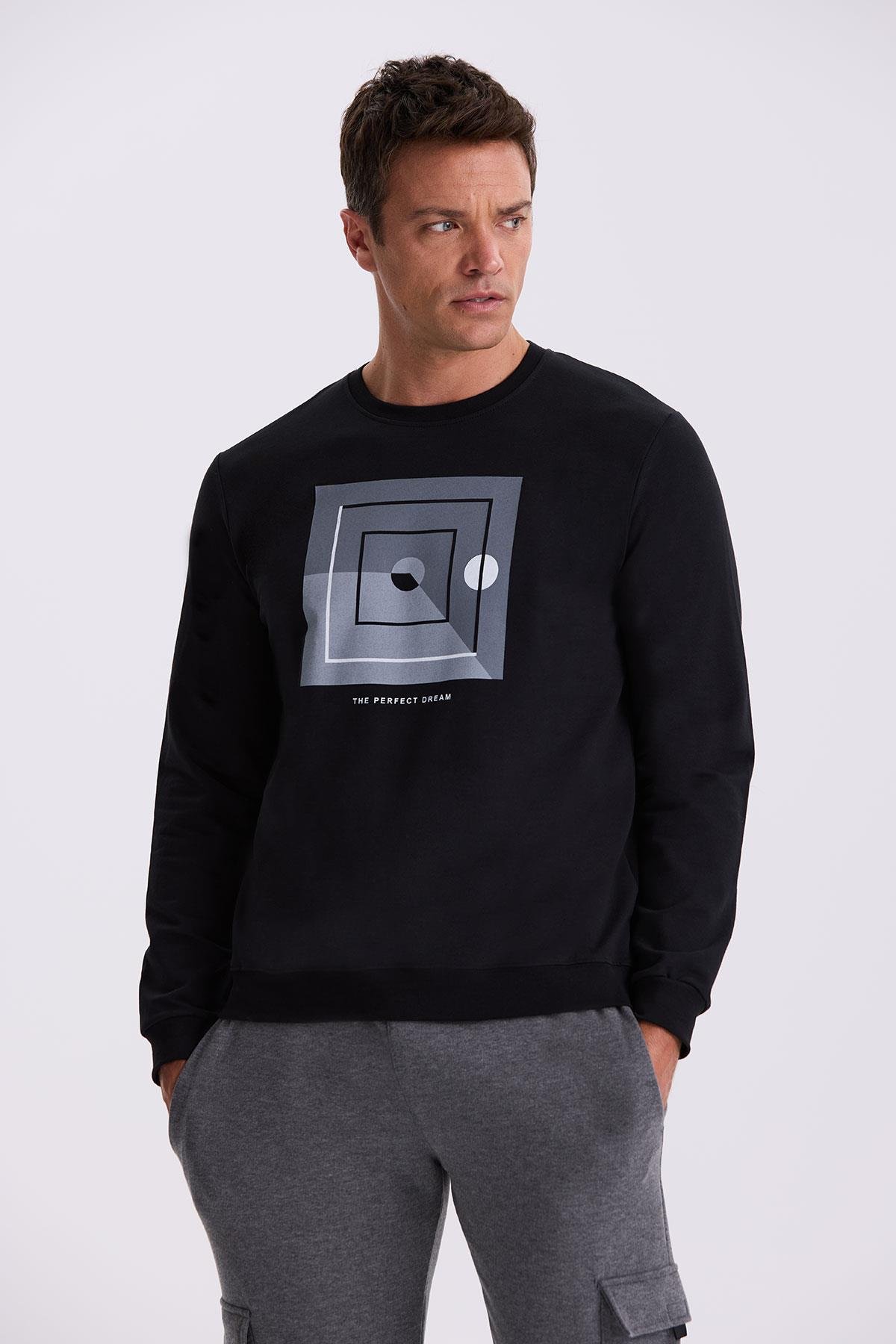 Siyah Slim Fit Bisiklet Yaka Baskılı %100 Pamuk Sweatshirt