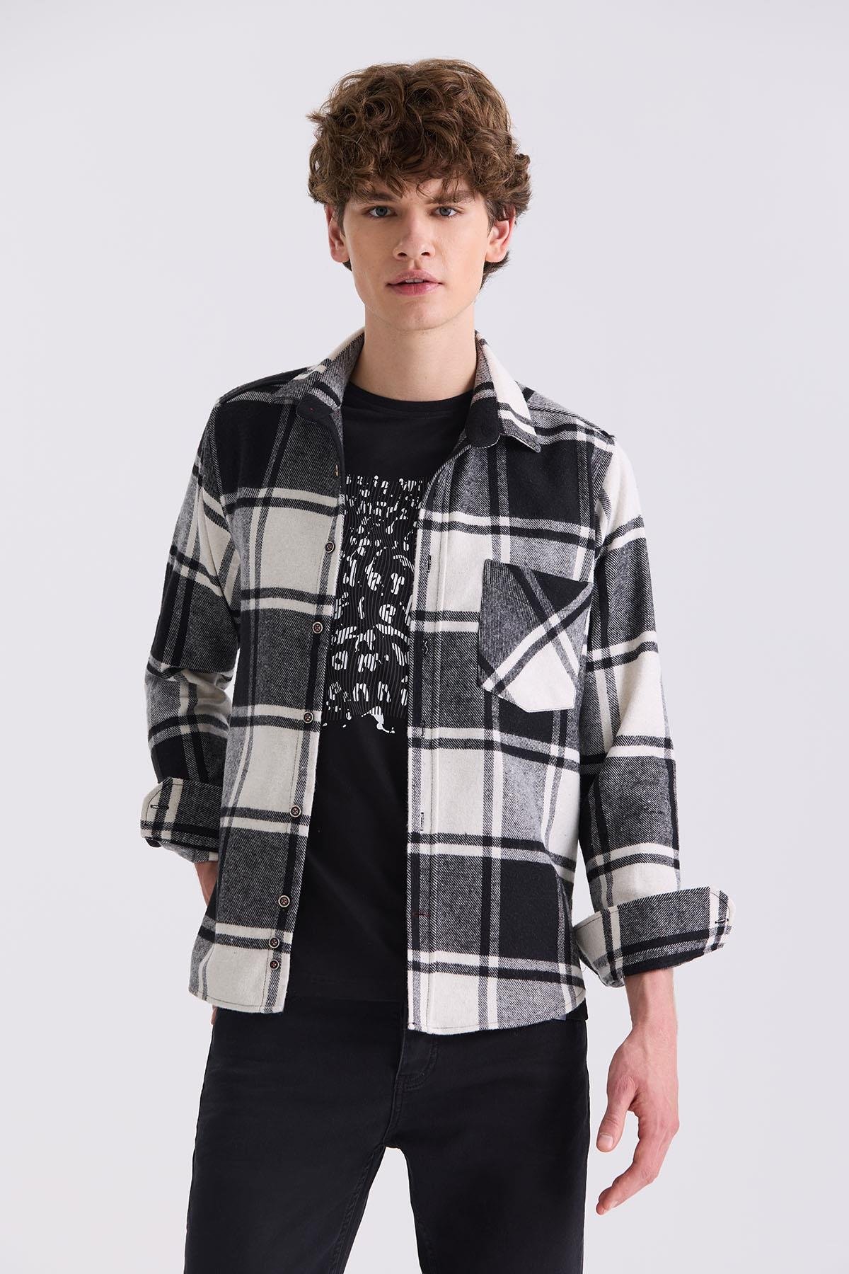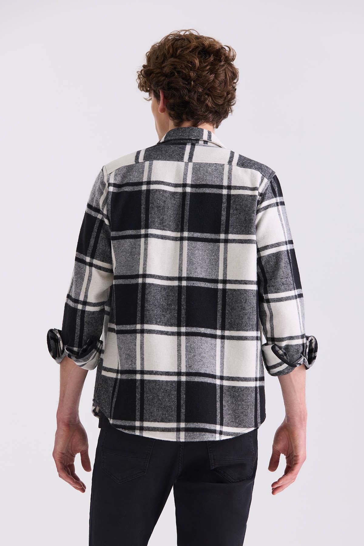 Siyah Slim Fit Ekose Desenli Pamuklu Cepli Oduncu Gömlek