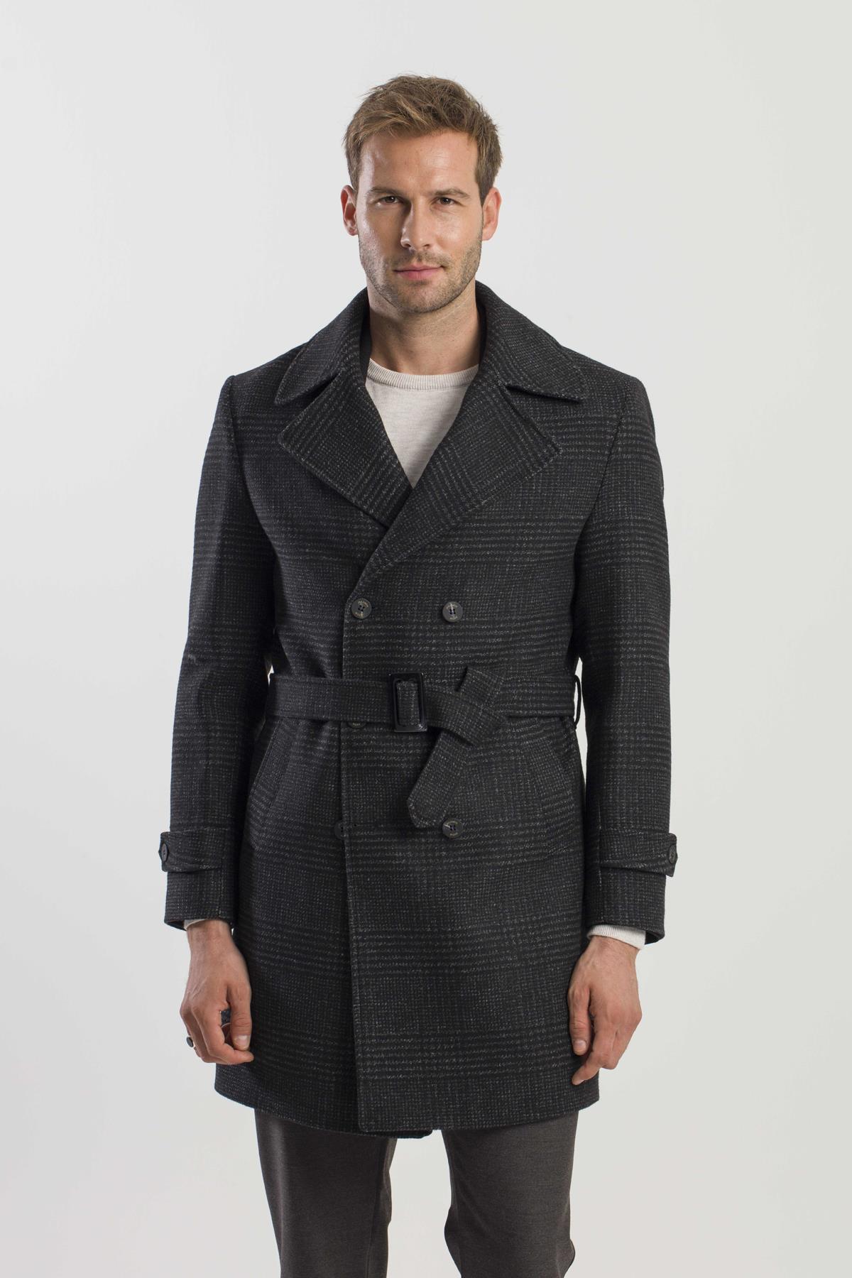 Siyah Slim Fit Gemici Yaka Ekoseli Yünlü Kaban