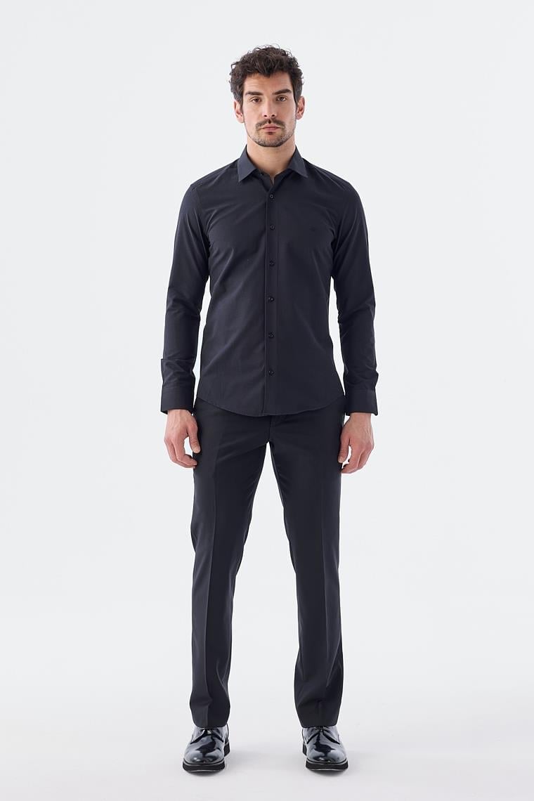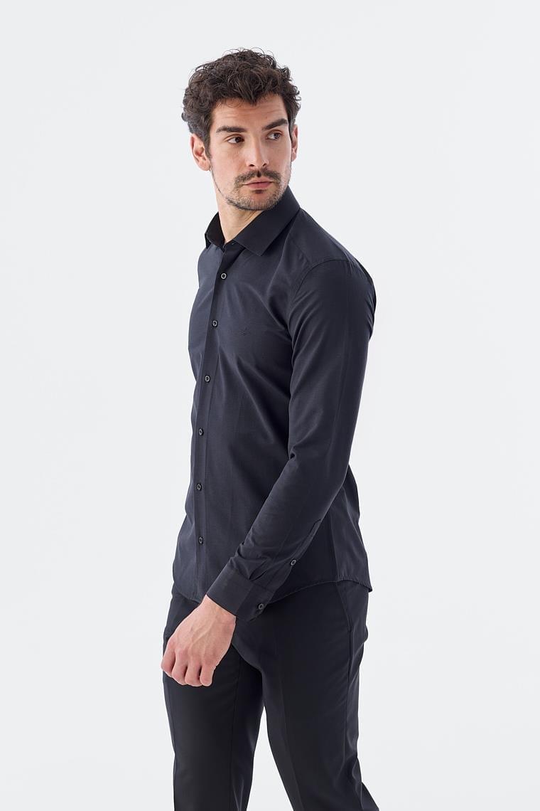 Siyah Slim Fit İtalyan Yaka Uzun Kol Klasik Kravatlık Pamuklu Gömlek