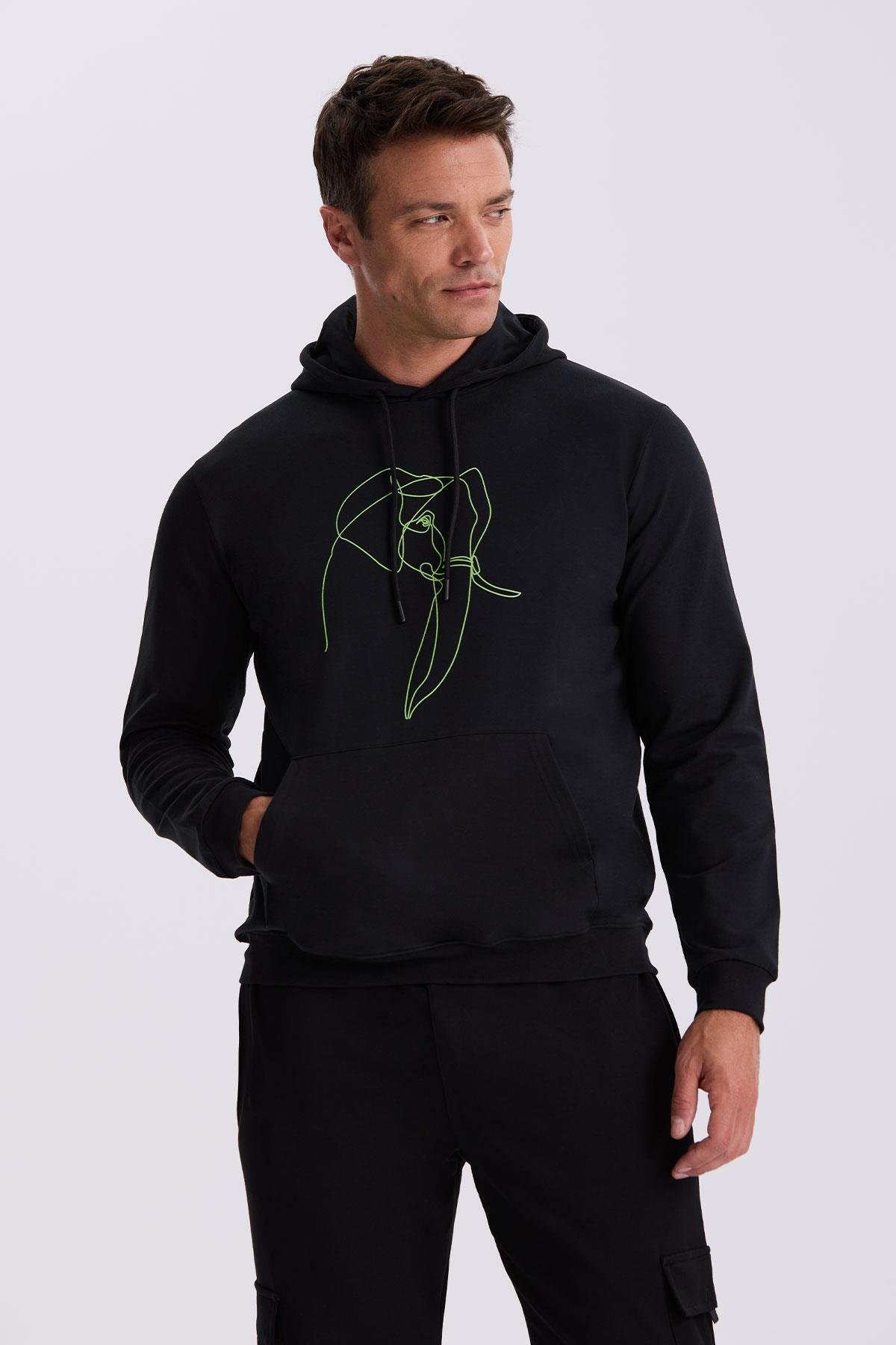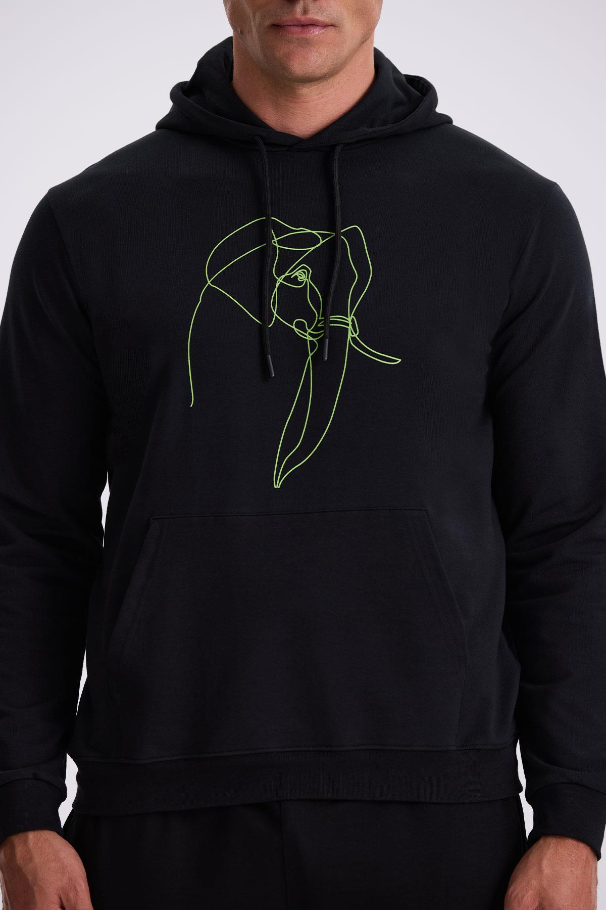 Siyah Slim Fit Kapüşonlu Baskılı %100 Pamuk Sweatshirt