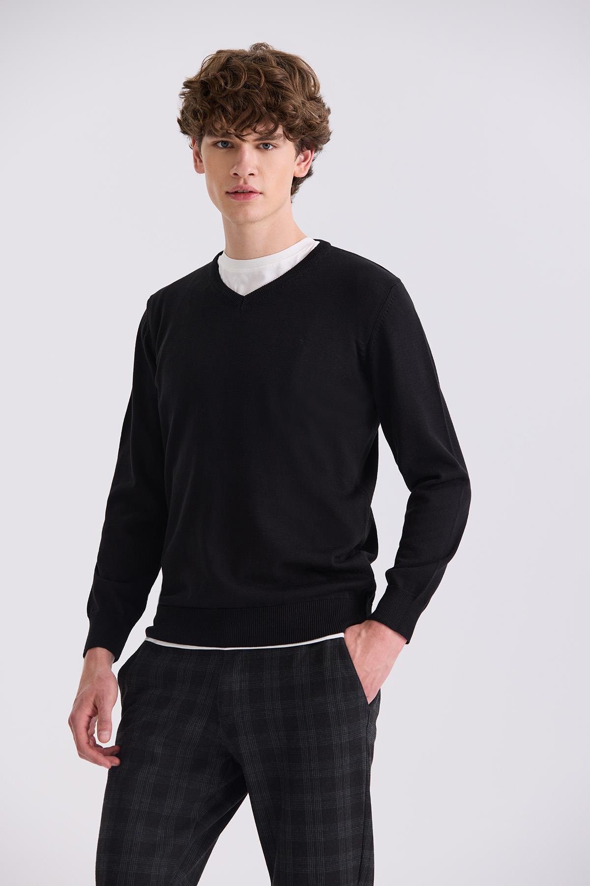 Siyah Slim Fit V Yaka Triko Kazak