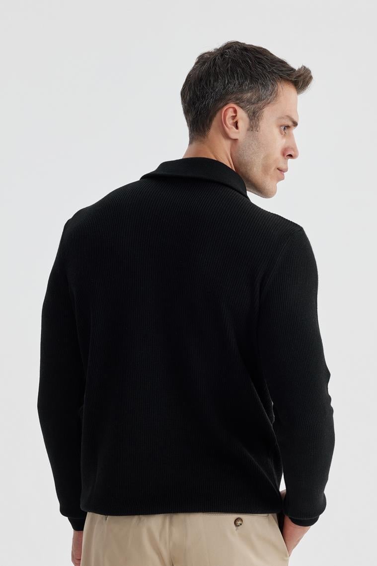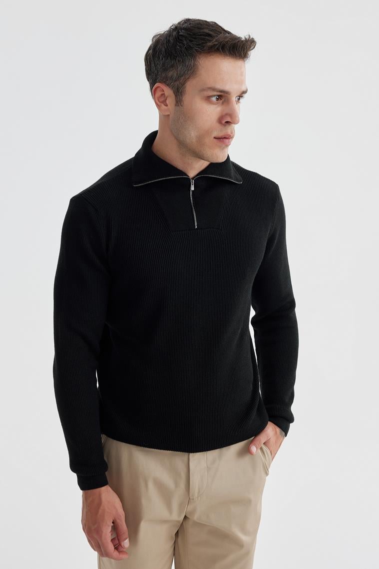 Siyah Slim Fit Yünlü Fermuarlı Yaka Triko
