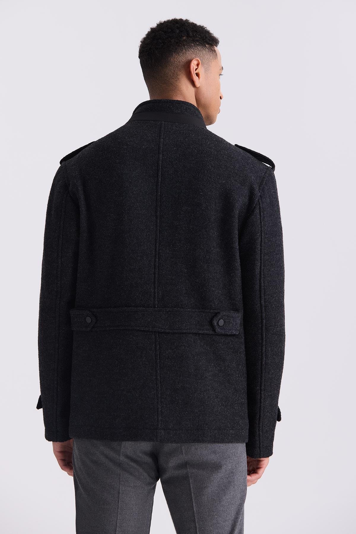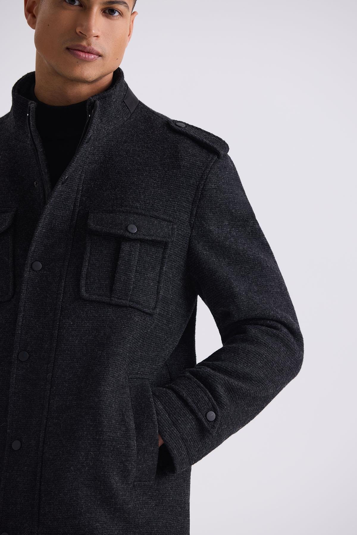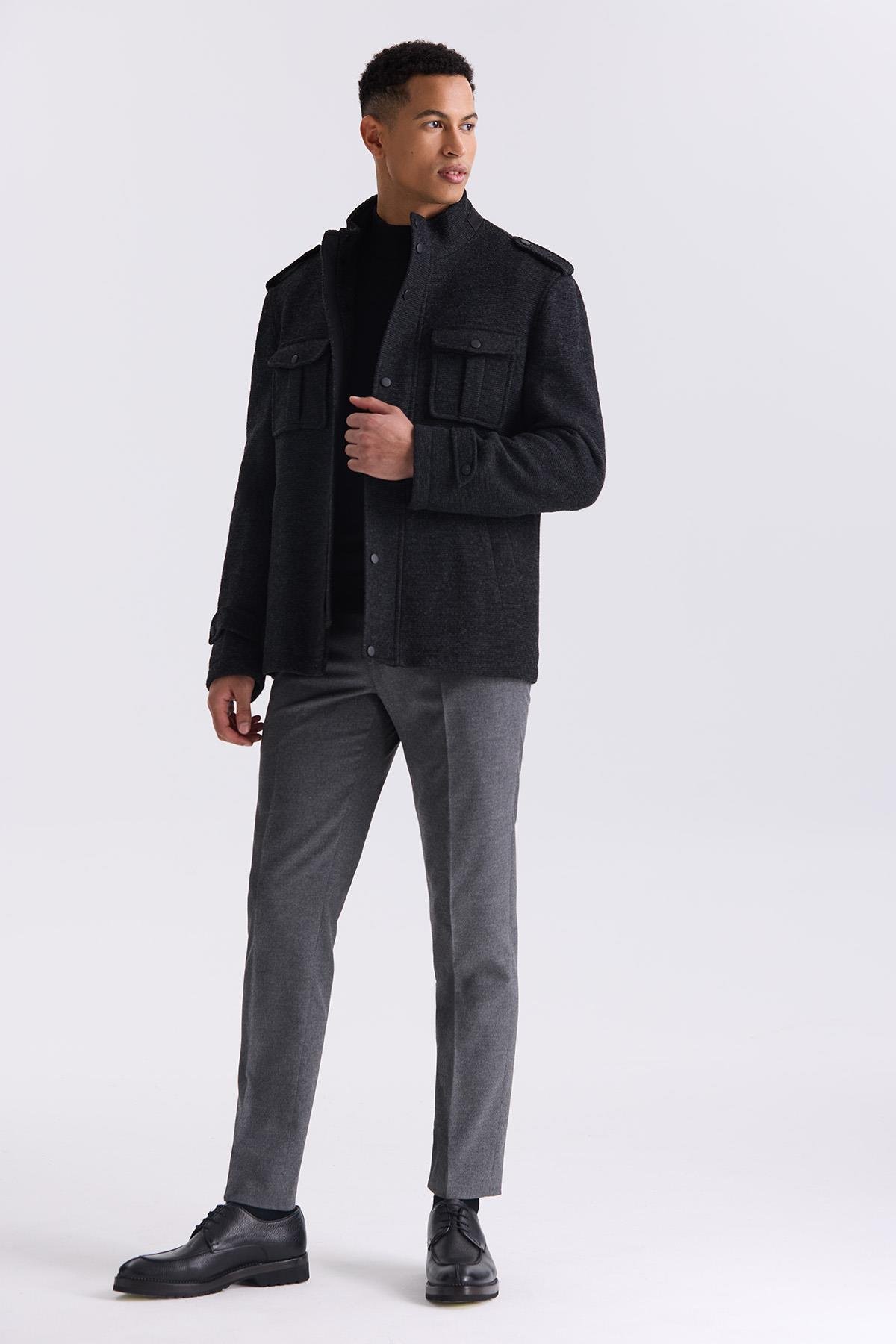 Siyah-1 Slim Fit Hakim Yaka Apoletli Desenli Spor Kaşe Kaban