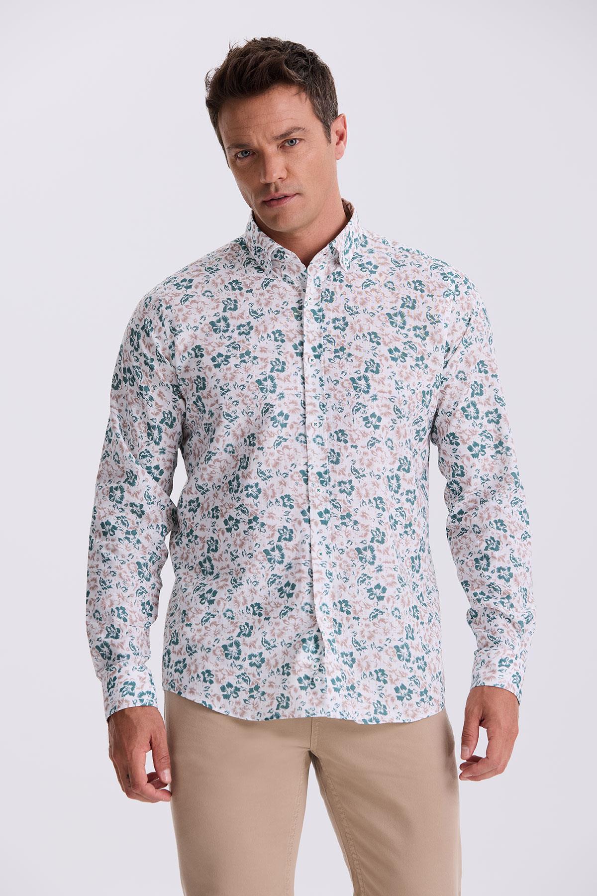 Yeşil Çiçek Desenli Yaka Düğmeli Comfort Fit Gömlek