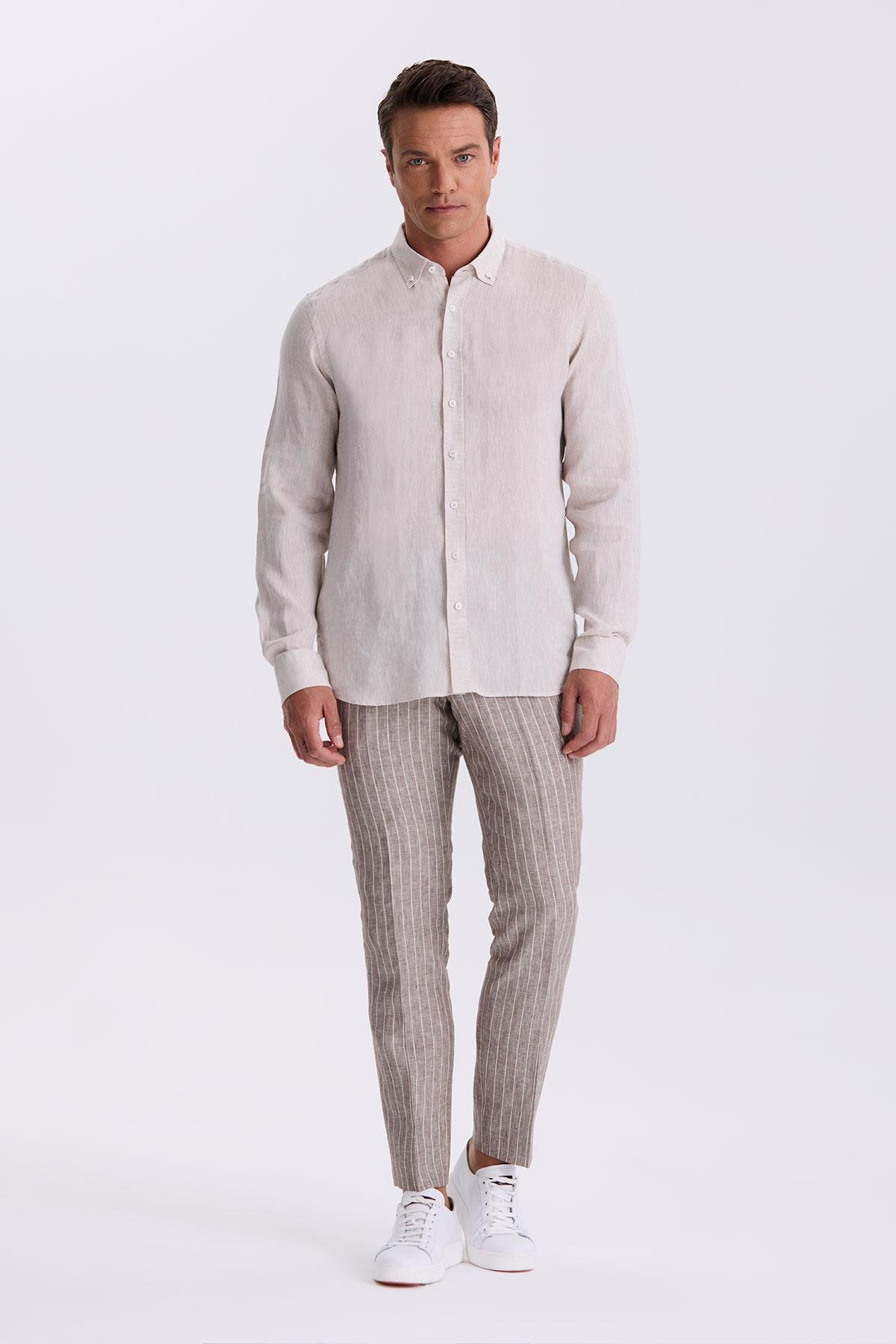Bej %100 Keten Düğmeli Yaka Comfort Fit Gömlek