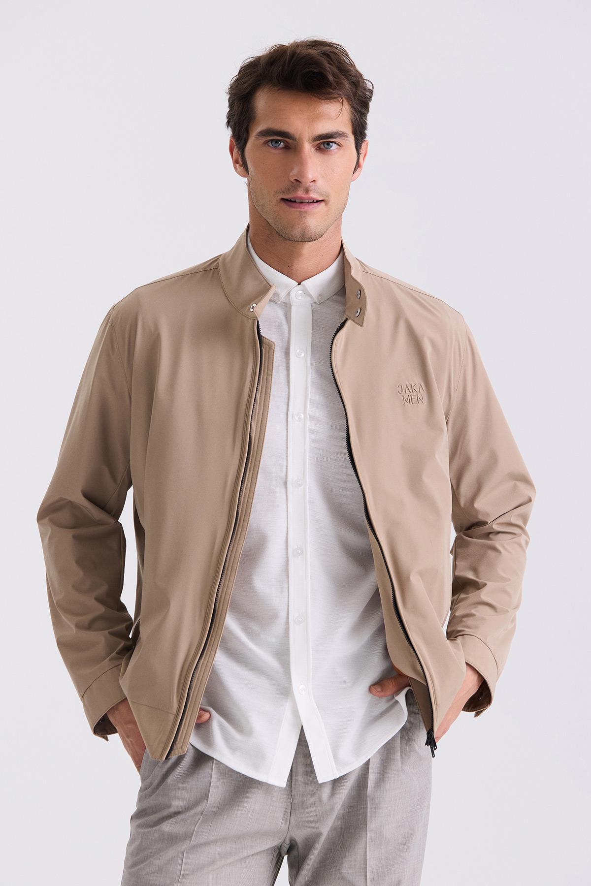 Bej Comfort Fit Dik Yaka Önü Fermuarlı Mevsimlik Mont