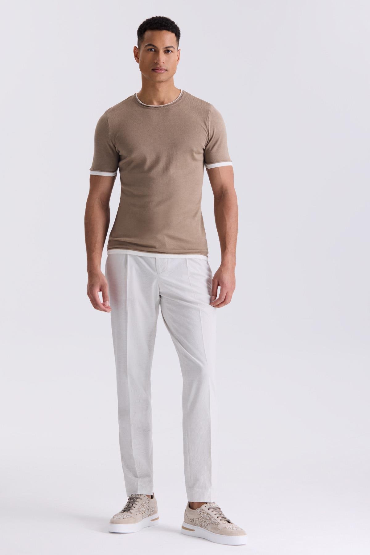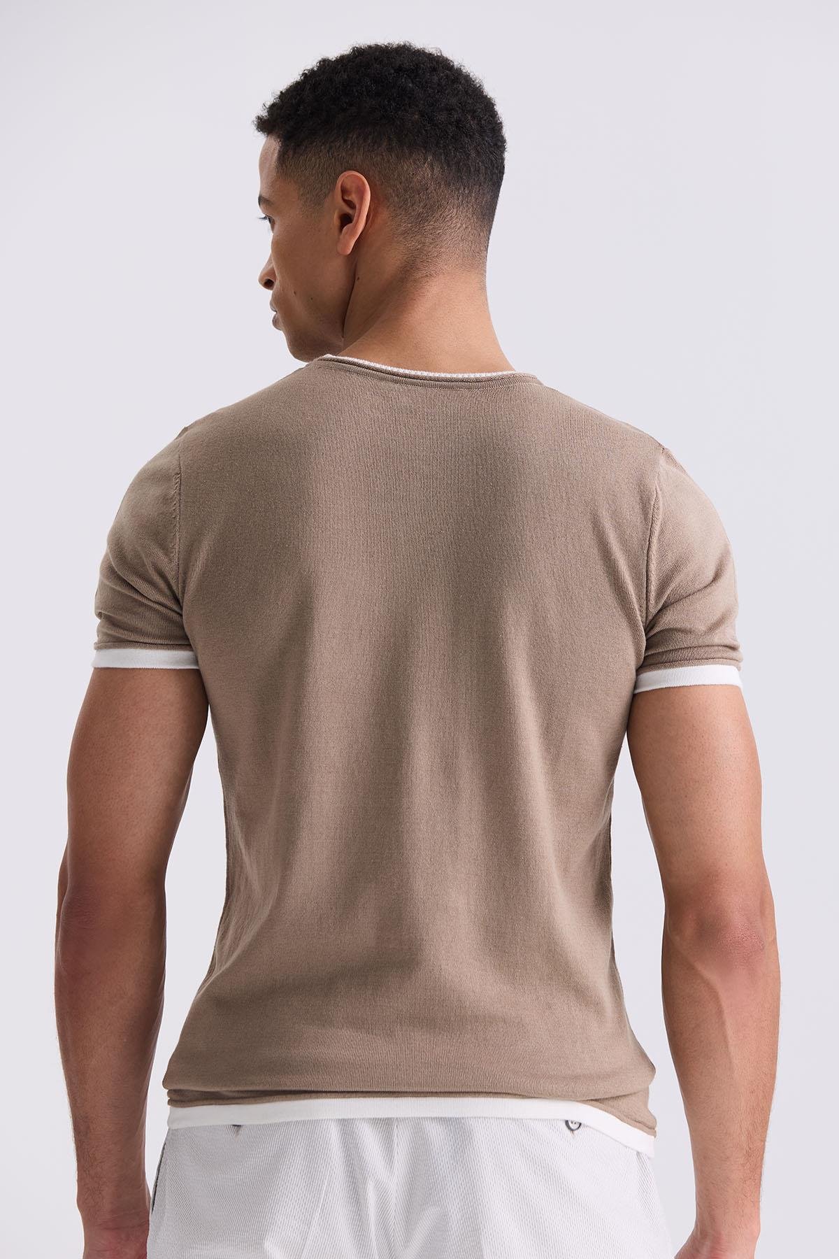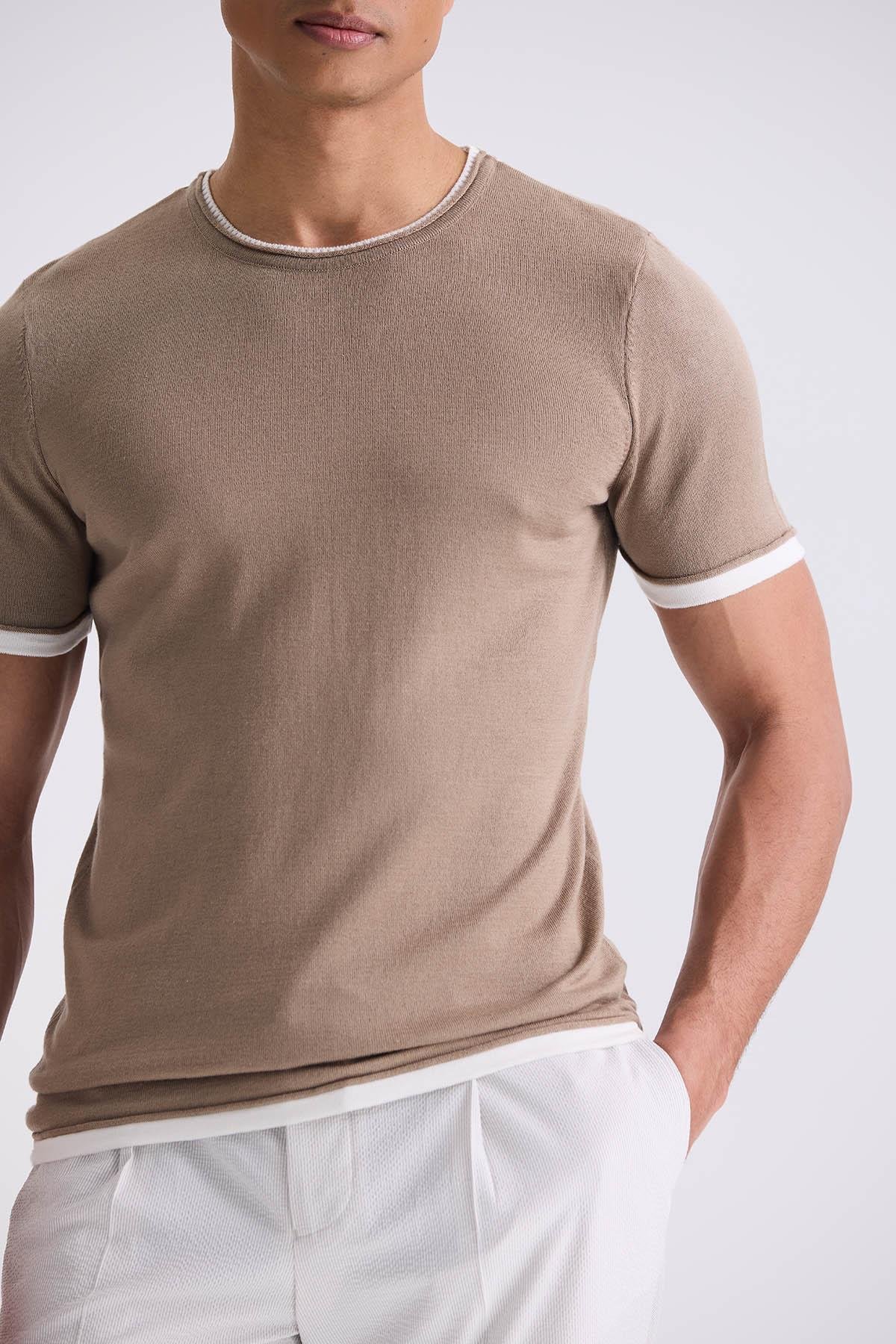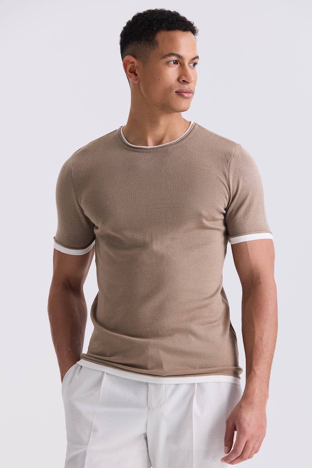 Bej Slim Fit Triko Bisiklet Yaka T-Shirt