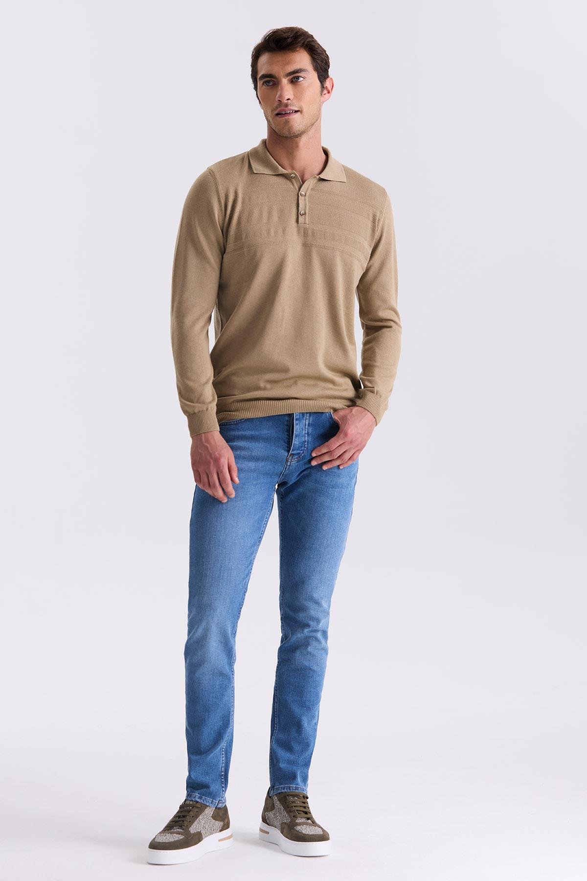Bej Classic Fit Düğme Detaylı Polo Yaka Triko Kazak