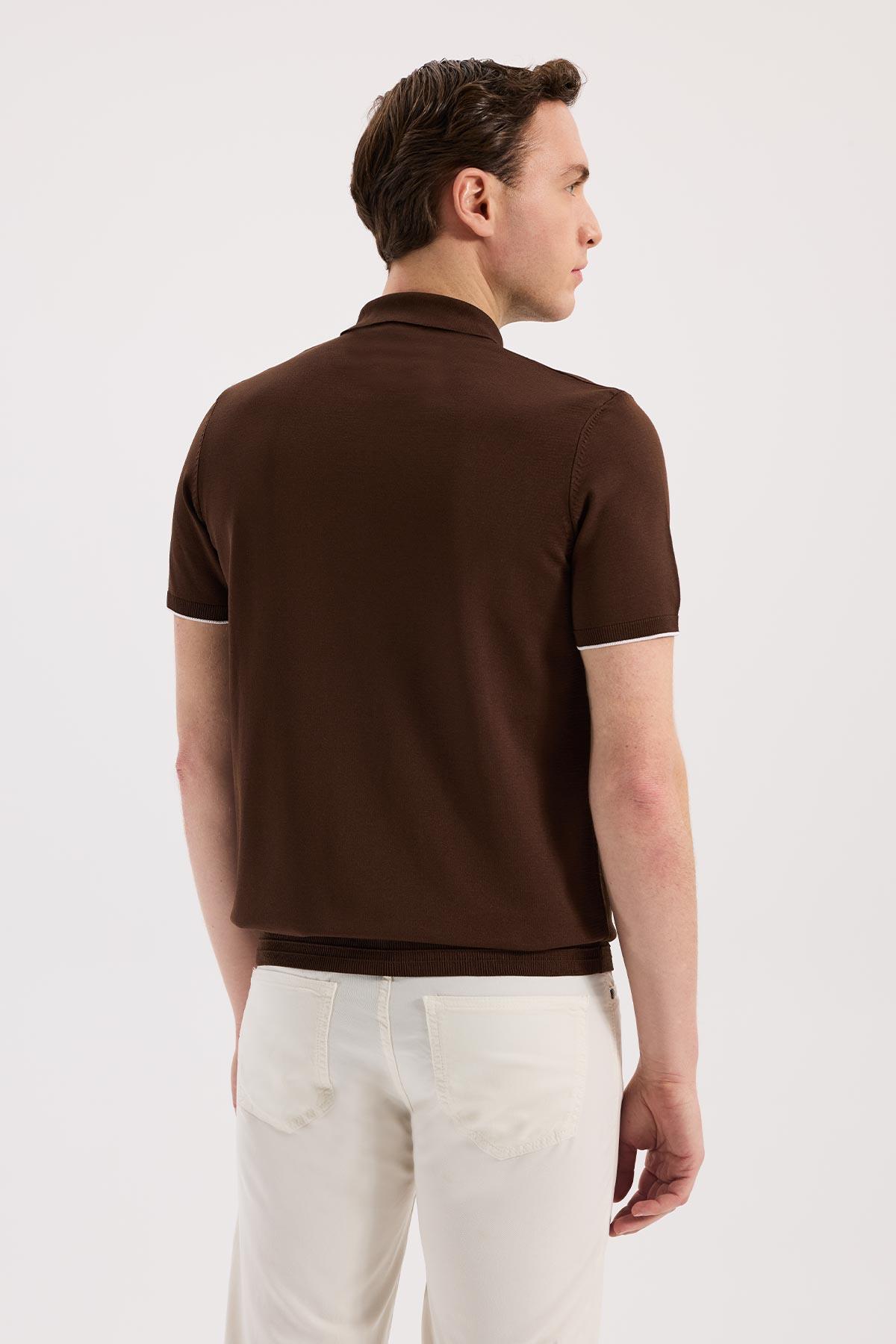 Kahve Dar Kalıp - Slim Fit T-Shirt Polo Yaka Fermuarlı
