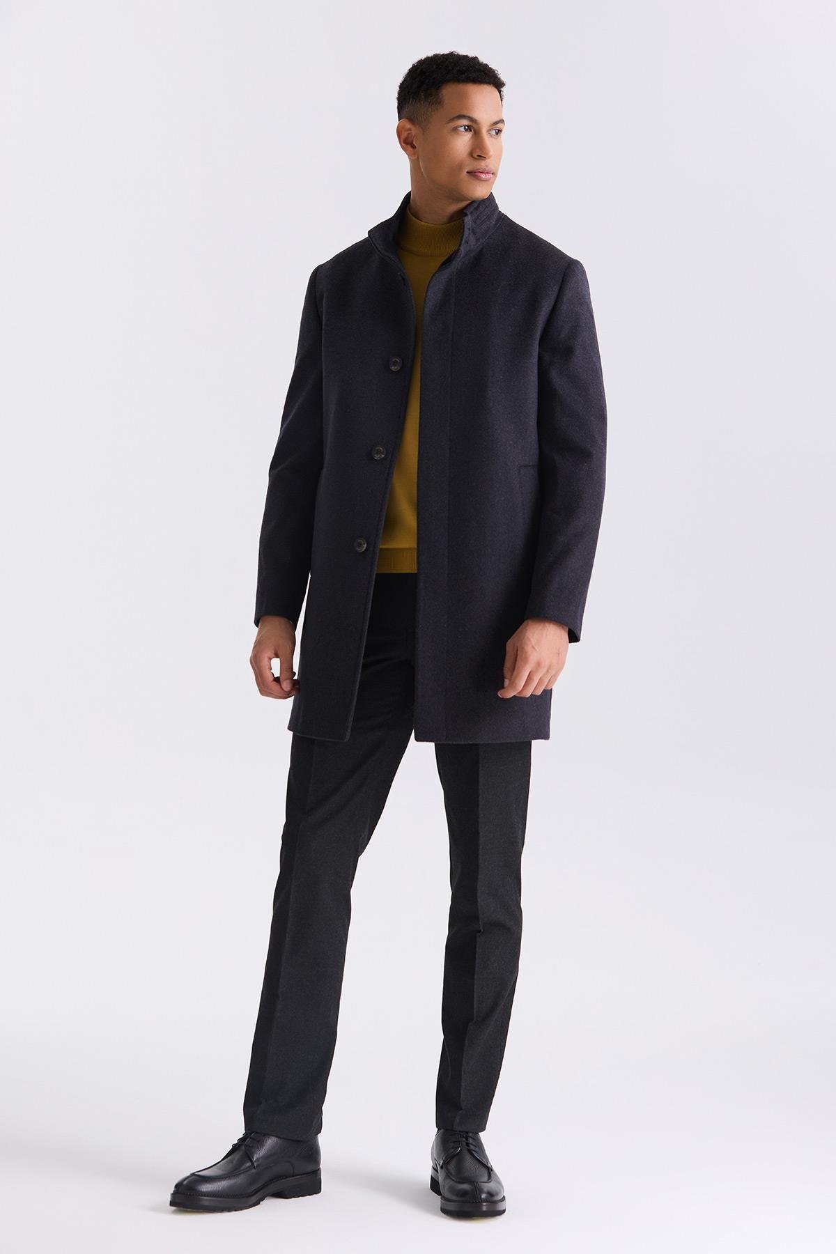 Koyu Lacivert1 Slim Fit Dik Yaka Balık Sırtı Desenli Yünlü Spor Kaban