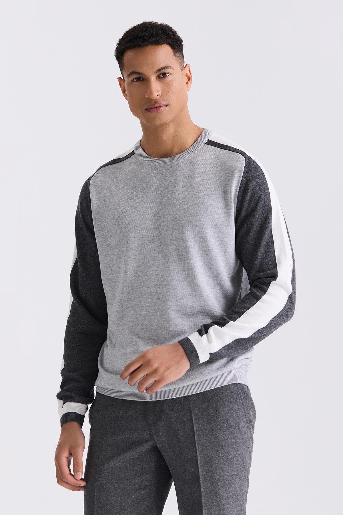 Gri Slim Fit Şerit Detaylı Bisiklet Yaka Triko Kazak